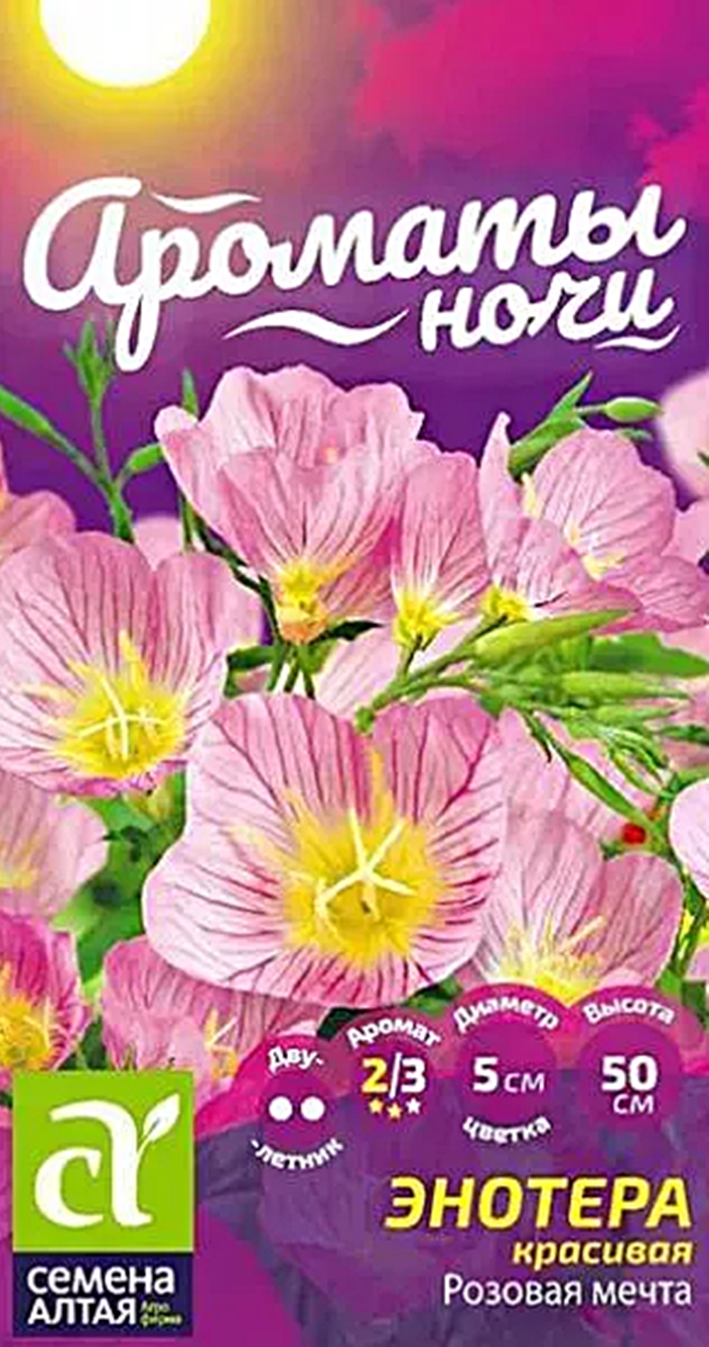 Двулетник, образующий в год посева несколько гибких цветущих побегов высотой 25-60 см. Цветки чашевидные ароматные, нежной орхидно-розовой окраски, диаметром до 5 см, собраны в малоцветковые верхушечные соцветия. Скромную красоту этого цветка подчеркнет соседство в композиции с астильбами, колокольчиками, вероникой, агератумом, лобелией. Особенно выразительна энотера на переднем плане цветников и в полутенистых местах. Цветет с июня до середины августа. Неприхотливое, но недостаточно зимостойкое растение. Предпочитает солнечные участки с легким притенением на хорошо дренированных нейтральных почвах. Посев на рассаду в марте по поверхности субстрата, засыпая стерильным песком на 1-2 мм. Посевы содержат при температуре 16-20°С, не допуская пересыхания грунта. Похожие товары