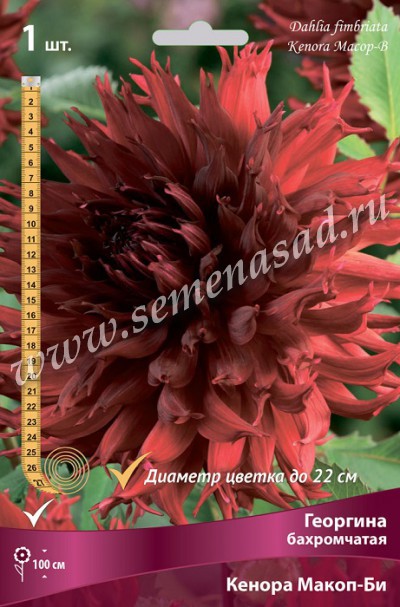 Георгина – популярное садовое растение с крупными перистыми листьями и оригинальными соцветиями-корзинками. Растения высотой 40-120 см, обильно ветвятся, формируя пышные кусты с обилием цветоносов. Корзинки немахровые и полумахровые, окраска язычковых цветков самая разнообразная, ярких и пастельных тонов, контрастная и меланжевая. Бахромчатые георгины - иногда их еще называют Рассеченные – относительно новая группа георгин с крупными густо-махровыми цветками. Цветки имеют узкие лепестки (язычковые цветки), свернутые у основания и рассеченные на краях – за счет этого смотрятся, по настоящему, великолепно! Месторасположение: солнечные, защищенные от холодных и сильных ветров места с хорошей циркуляцией воздуха. Нельзя высаживать георгины на низких и заболоченных участках. Почва: растут на любых почвах, но оптимальной для них является богатый перегноем жирный садовый суглинок или хорошо удобренная песчаная почва с кислотностью рН 6,5-6,7. Посадка начинается, когда минует опасность поздних июньских заморозков. Желательно высаживать предварительно пророщенный посадочный материал. Лунку копают на глубину 20-30 см. Клубни в посадочной яме располагают так, чтобы после заделки ямы корневая шейка была на 2-3 см ниже уровня почвы. Для высокорослых сортов сразу продумывают систему подвязки. Уход: заключается в своевременных поливах, рыхлении и окучивании. Несколько раз за сезон требуются подкормки жидкими органическими удобрениями. Растение в грунте не зимует, поэтому перед наступлением устойчивых холодов клубни выкапывают, хранят в емкостях, засыпанных торфом или песком в прохладном месте. Использование: низкорослые сорта пригодны для создания рабаток и бордюров, для украшения патио. Большинство же сортов применяется в свободных композициях и групповых посадках, в одиночной — эффектны обильноцветущие или крупноцветные. Сорта с длинными и прочными цветоносами используют на срезку. Кенора Макоп-Би - высота растения 100 см. Цветок очень крупный, диаметром 22 см, бархатный, глубокого темно-красного цвета. Похожие товары