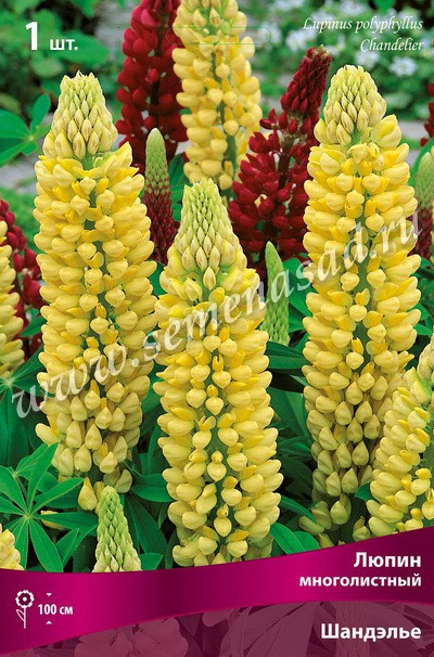 Люпины - однолетние, двулетние и многолетние корневищные травянистые растения, реже полукустарники. Листья пальчатые, на длинных черешках, собраны в прикорневую розетку; стеблевые — расположены в очередном порядке. Цветки в кистевидных соцветиях, белые, желтые, голубые, фиолетовые, розовые, кремовые, карминовые, красные, пурпуровые. Месторасположение: предпочитает солнечные участки, защищенные от холодных северных ветров. Почва: подходит любая садовая почва, нейтральная или слабокислая, умеренно влажная. Размножение: семенами и вегетативно. Цветение: июнь-июль. Использование: в одиночных и групповых посадках, особенно красивы в смеси сортов. Подходят для миксбордеров, рабаток. Люпин многолистный - растение многолетнее, травянистое, 80-120см высотой. Стебли прямые, прочные, почти голые. Листья пальчатые, на длинных черешках, с 9-15 снизу опушенными листочками. Цветки синие, собраны в многоцветковые кистевидные соцветия 30-35см длиной. Цветет в июне 20-30 дней, если удалять отцветающие соцветия — вторично в августе. Шандэлье - высота растения 100см, цветки светло-желтые. Цветение июнь-июль. Похожие товары