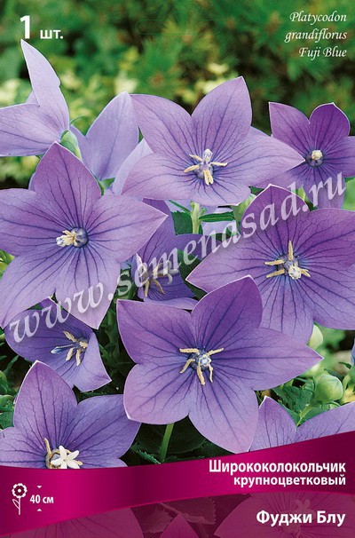 Ширококолокольчик крупноцветковый – многолетник с тонкими стеблями до 60см высотой. Корни веретеновидные. Листья овально-ланцетные, по краю мелкозубчатые, нижние в прикорневой розетке. Цветки одиночные или в малоцветковой кисти, ширококолокольчатые, с пятью широкими зубцами, до 8см в диаметре, синие или белые. Есть карликовые и полумахровые корни. Месторасположение: предпочитает открытые солнечные места, но выносит и полутень. Почва: умеренно сухая, свежая, рыхлая, богатая питательными веществами. Необходим дренаж. Застоя грунтовых вод растения не переносят. Размножение: семенами и вегетативно. Цветение: в июле-августе. Использование: очень эффектны небольшими группами на газоне, хороши в букетах, срезку производят, когда раскроются все цветки. Фуджи Блю – высота растения 40см, цветки голубые. Цветение июнь-август. Похожие товары