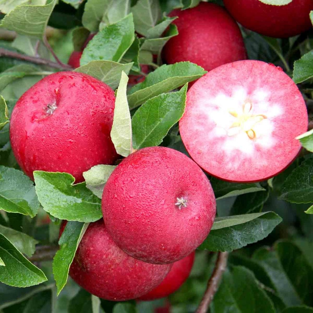 Осеннего срока потребления. Уникальный, ранне-зимний, красномякотный сорт, селекция Германии. Самый вкусный среди всех красномякотных яблок. Дерево среднерослое, морозостойкость высокая, средняя устойчивость к парше. Созревание в последней декаде сентября. Хранение до января. Яблоки красные, с белыми точечками, средний вес 180-200 г. Мякоть необычного, красного цвета, очень сочная, плотная. Сок тоже красный. Красный цвет мякоть имеет благодаря наличию особого пигмента «антоциана». Антоцианы уничтожают вредные бактерии в организме человека, повышают тем самым его иммунитет. Особенно полезны антоцианы в период болезней. Также содержание антиоксидантов почти в 2 раза больше, чем в обычных яблоках! Его шутя называют «молодильным яблоком». Вкус приятный, с тонким ароматом, кисло-сладкий, хорошо сбалансированный, мягкий. Урожайность до 20 кг с дерева. Плоды используют для употребления свежими, в кулинарии, консервации и для сушки. Ломтики сохраняют свою форму при варении и имеют привлекательный красный цвет. Похожие товары