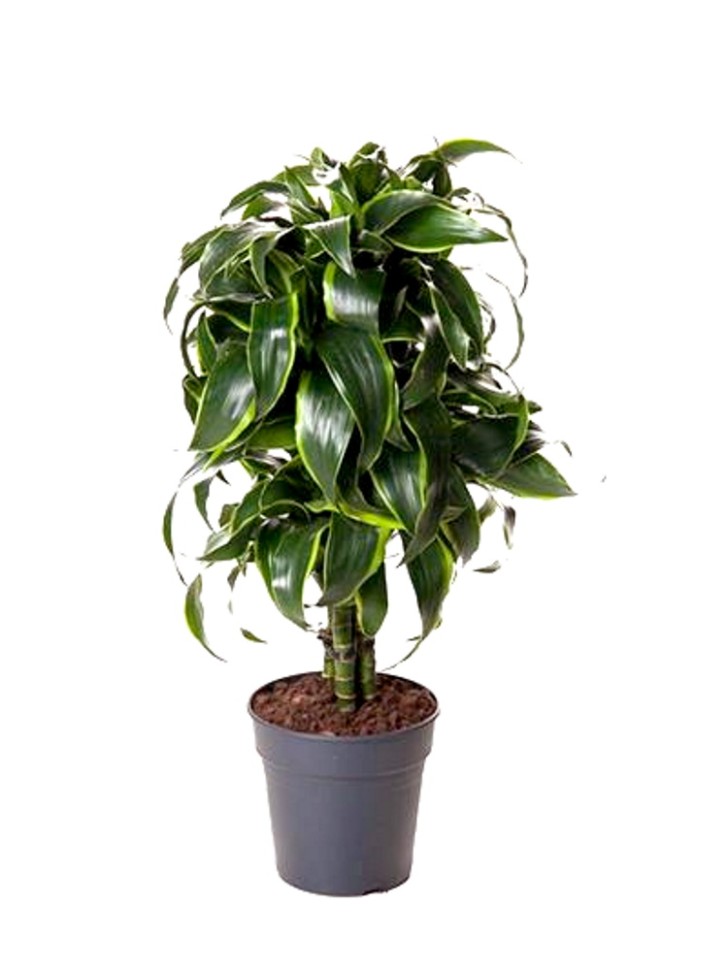 Пышный куст драцены фрагранс Дорадо с темно-зелеными листьями и жёлтой окантовкой. В горшке плотно посажено несколько стеблей, благодаря чему растение выглядит объемным. Похожие товары