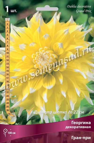 Георгина – популярное садовое растение с крупными перистыми листьями и оригинальными соцветиями-корзинками. Растения высотой 40-120 см, обильно ветвятся, формируя пышные кусты с обилием цветоносов. Корзинки немахровые и полумахровые, окраска язычковых цветков самая разнообразная, ярких и пастельных тонов, контрастная и меланжевая. Георгина декоративная - это самый представительный и многочисленный класс георгин. Полностью махровый цветок, диаметром от 10 до 25 см, имеет плоские лепестки (язычковые цветки), слегка закрученные и отогнутые к стеблю, что делает его необыкновенно пышным и эффектным. Окраска самая разнообразная. Месторасположение: солнечные, защищенные от холодных и сильных ветров места с хорошей циркуляцией воздуха. Нельзя высаживать георгины на низких и заболоченных участках. Почва: растут на любых почвах, но оптимальной для них является богатый перегноем жирный садовый суглинок или хорошо удобренная песчаная почва с кислотностью рН 6,5-6,7. Посадка начинается, когда минует опасность поздних июньских заморозков. Желательно высаживать предварительно пророщенный посадочный материал. Лунку копают на глубину 20-30 см. Клубни в посадочной яме располагают так, чтобы после заделки ямы корневая шейка была на 2-3 см ниже уровня почвы. Для высокорослых сортов сразу продумывают систему подвязки. Уход: заключается в своевременных поливах, рыхлении и окучивании. Несколько раз за сезон требуются подкормки жидкими органическими удобрениями. Растение в грунте не зимует, поэтому перед наступлением устойчивых холодов клубни выкапывают, хранят в емкостях, засыпанных торфом или песком в прохладном месте. Использование: низкорослые сорта пригодны для создания рабаток и бордюров, для украшения патио. Большинство же сортов применяется в свободных композициях и групповых посадках, в одиночной — эффектны обильноцветущие или крупноцветные. Сорта с длинными и прочными цветоносами используют на срезку. Гран-при - высота растения 90 см. Цветок очень крупный, диаметром 22 см, ярко-жёлтый. Кончики лепестков белые. Похожие товары