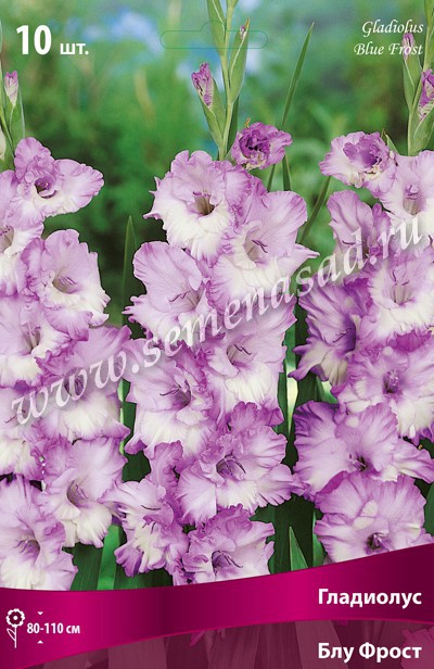 Гладиолусы - растения многолетние, клубнелуковичные. Стебли вертикальные, неветвящиеся, одиночные, облиственные 50-150см высотой. Листья линейные или мечевидные 50-80см длиной. Цветки собраны в одностороннее, двустороннее или спиральное колосовидное соцветие до 80см длиной, рыхлое, среднеплотное или плотное. Цветки сидячие с простым воронковидным околоцветникомизшести неодинаковых долей, сросшихся основаниями, различной величины и формы. Клубнелуковица округлая, возобновляется ежегодно, одета пленчатыми чешуями от белой до черно-вишневой окраски. Месторасположение: хорошо освещенные, защищенные от ветра участки. Почва: хорошо растут и цветут на любой достаточно дренированной почве со слабокислой реакцией. Посадка: мелкие клубнелуковицы высаживают через 5-10см друг от друга, крупные – через 10-15см. Глубина посадки клубнелуковиц на тяжелых почвах 8-10см, на легких – 10-13см. Цветение: июль-сентябрь. Размножение: вегетативно (клубнелуковицами и клубнепочками) и семенами. Использование: в цветниках, на клумбах, для срезки. Блу Фрост - высота растения 80-110см, голубой с белым, слегка гофрированный. Похожие товары