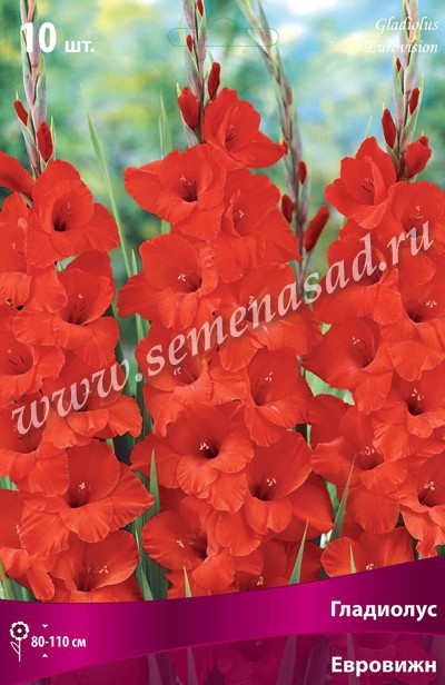 Гладиолусы - растения многолетние, клубнелуковичные. Стебли вертикальные, неветвящиеся, одиночные, облиственные 50-150см высотой. Листья линейные или мечевидные 50-80см длиной. Цветки собраны в одностороннее, двустороннее или спиральное колосовидное соцветие до 80см длиной, рыхлое, среднеплотное или плотное. Цветки сидячие с простым воронковидным околоцветникомизшести неодинаковых долей, сросшихся основаниями, различной величины и формы. Клубнелуковица округлая, возобновляется ежегодно, одета пленчатыми чешуями от белой до черно-вишневой окраски. Месторасположение: хорошо освещенные, защищенные от ветра участки. Почва: хорошо растут и цветут на любой достаточно дренированной почве со слабокислой реакцией. Посадка: мелкие клубнелуковицы высаживают через 5-10см друг от друга, крупные – через 10-15см. Глубина посадки клубнелуковиц на тяжелых почвах 8-10см, на легких – 10-13см. Цветение: июль-сентябрь. Размножение: вегетативно (клубнелуковицами и клубнепочками) и семенами. Использование: в цветниках, на клумбах, для срезки. Евровижн - высота растения 80-110см, красный с белым штрихом, слегка гофрированный. Похожие товары