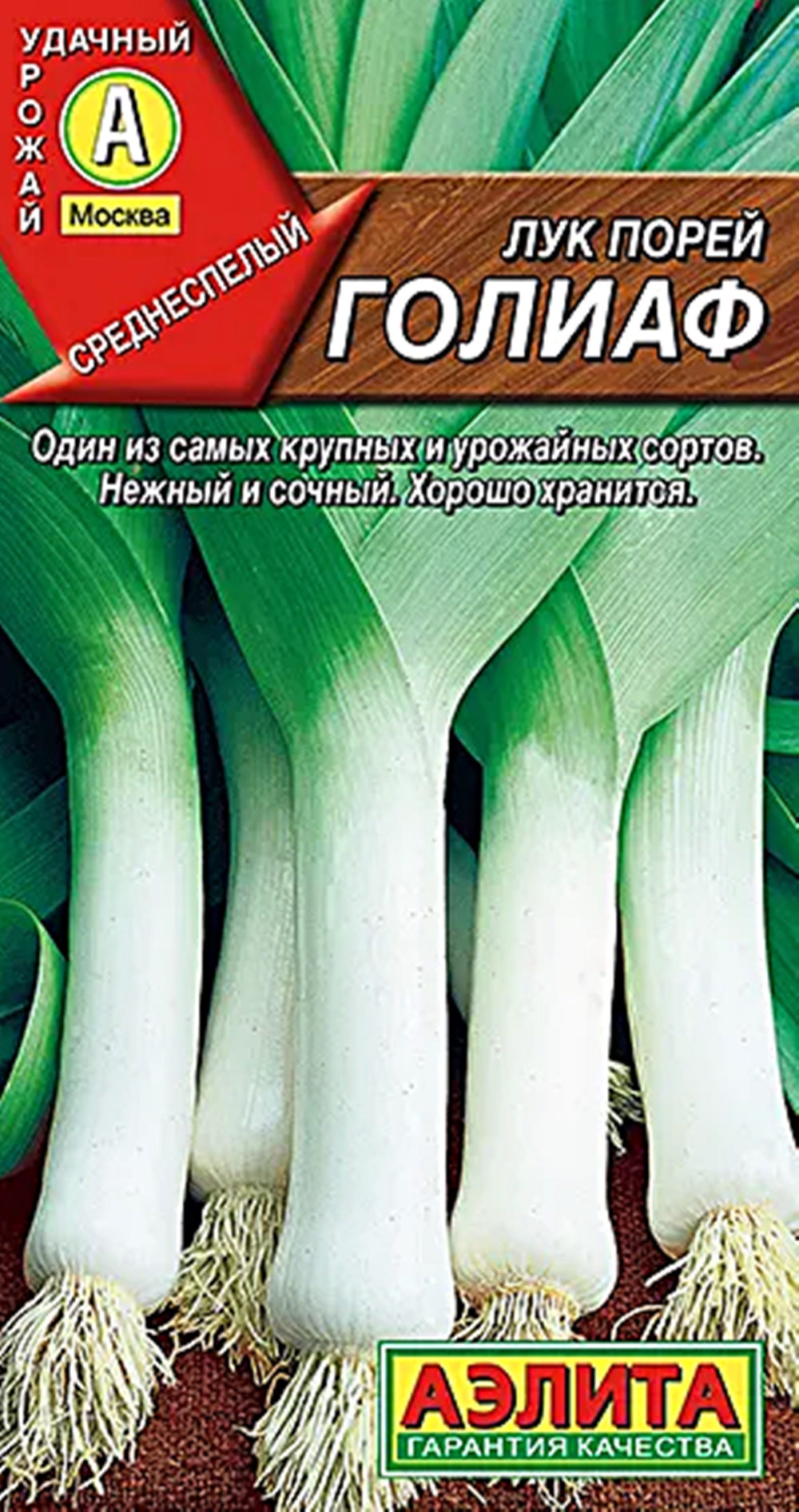 Популярный надежный сорт, крупный и вкусный. Раннеспелый, от всходов до уборки около 130 дней. Растения мощные, средней высоты, растут быстро. Отбеленная часть крупная, толстая, длиной до 28 см, плотная и сочная. Луковица выражена слабо. Масса продуктивной части 150-200 г. Вкус отличный. Используется в свежем виде и в кулинарии. После уборки хранится продолжительное время. Сорт не сложен в уходе, подходит для выращивания в любом регионе нашей страны. Похожие товары