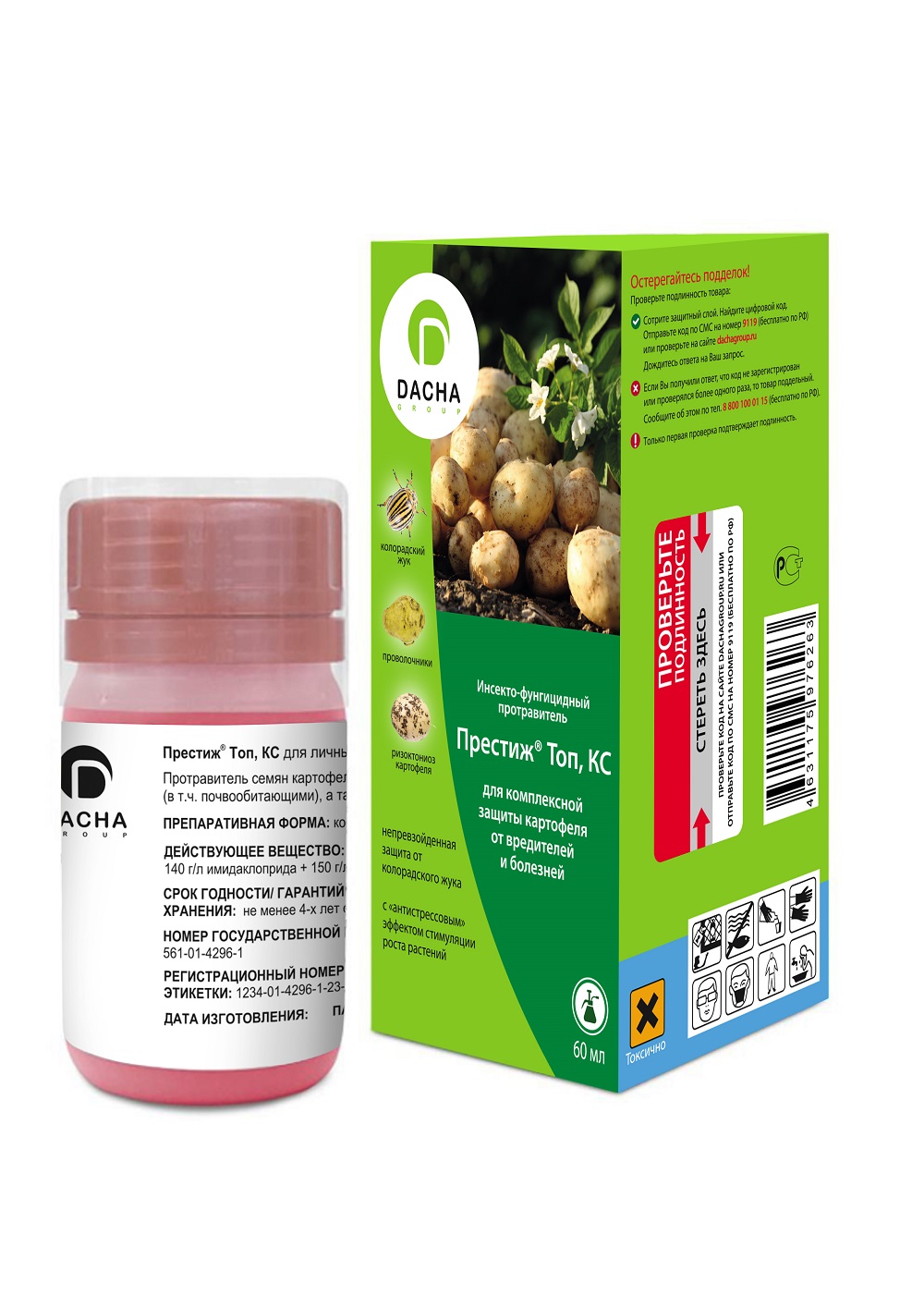 Средство системно-контактного действия для протравливания клубней картофеля перед посадкой, которое предотвращает распространение колорадского жука, проволочника, личинок майского жука, цикадки, тли, трипсов. Обладает фунгицидным действием. Активен против ризоктониоза и парши обыкновенной, а также имеет дополнительный эффект против других видов парши и мокрых гнилей картофеля. Средство повышает устойчивость картофеля к биотическим и абиотическим воздействиям окружающей среды, увеличивает всхожесть, улучшает побегообразование и рост вегетативной массы. Похожие товары