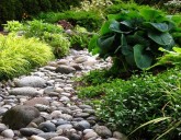 Сухой ручей в ландшафтном дизайне получил большую популярность и пришёл к нам благодаря японской философии, согласно которой на любом участке земли возле дома обязательно должна присутствовать вода или её изображение. Воду в случае сухого ручейка с успехом заменяют различные камешки или небольшие валуны.