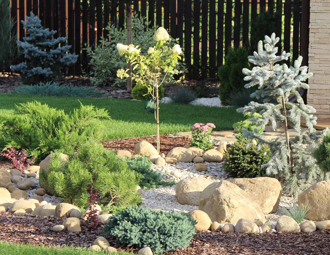 Природные камни должны естественным образом гармонировать с дизайном ландшафта. Очень важно учитывать их размер.