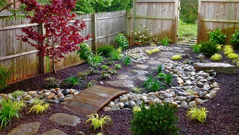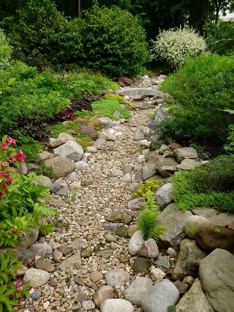 Сухой ручей в ландшафтном дизайне получил большую популярность и пришёл к нам благодаря японской философии, согласно которой на любом участке земли возле дома обязательно должна присутствовать вода или её изображение. Воду в случае сухого ручейка с успехом заменяют различные камешки или небольшие валуны.