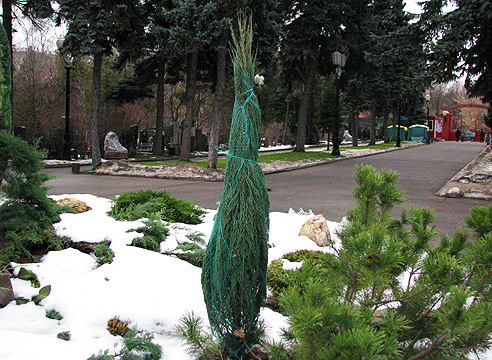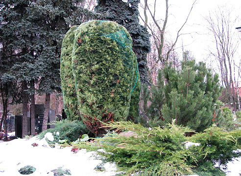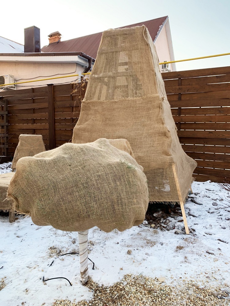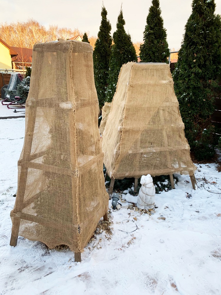 Некоторые виды растений нуждаются в укрытии на зиму. Разные растения требуют индивидуального подхода. Хвойные породы защищают деревянными конструкциями от облома ветвей и деформация формы кроны.