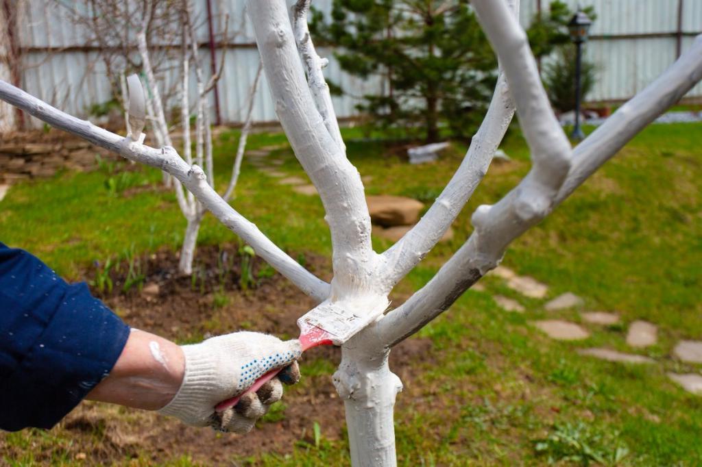 Удаление гнезд насекомых после зимы или поздней осенью, чистка и побелка стволов деревьев, обработка от болезней и вредителей, вывоз прошлогодних листьев и травянистой растительности. Известкование стволов растений. Комплексная обработка растений для защиты от болезней и вредителей.