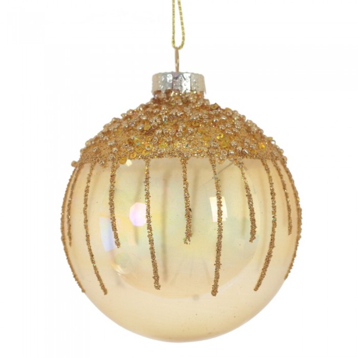 Елочный шар – классика новогоднего декора. Украшение представлено с декором из глиттера и бисера. Любая елка будет смотреться более привлекательно, если повесить на нее этот шар. Похожие товары