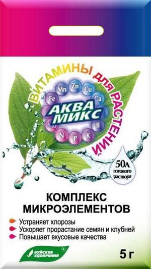 Удобрение "Аквамикс" - водорастворимый комплекс микроэлементов в хелатной форме (Mo и B - в неорганической). Удобрение применяется для предотвращения и компенсации недостатка микроэлементов. Удобрение используется при протравливании и дражировании семян овощных, корнеплодных культур, некорневых подкормок и внесении с поливом в открытом грунте и теплицах.