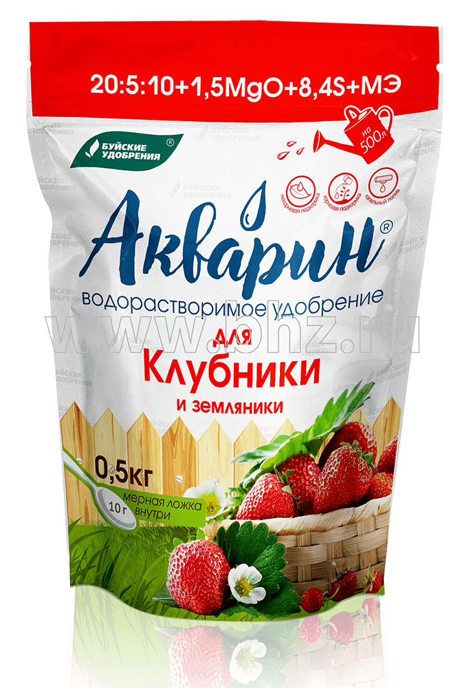 Доза применения препарата Корневая подкормка (полив) растений с интервалом 10-15 дней. Норма расхода: 10-20 г/10 л воды Расход поливочного раствора – 4-10 л/м2 Некорневая подкормка (опрыскивание) для уменьшения стрессового воздействия на растение в результате недостатка минерального питания, освещения, перепада температур или обработки химическими средствами защиты. По потребности. Норма расхода: 10-20 г/1 л воды Расход рабочего раствора – 1-1,5 л/10 м2 или до полного смачивания поверхности листьев Время, особенности применения *20 г – столовая ложка или спичечный коробок без горки Назначение товара: Удобрение предназначено для подкормок поливом или опрыскиванием любых цветочно-декоративных культур в течение всей вегетации. При совместном использовании со средствами защиты растений снимает стрессовое воздействие ядохимикатов на растения. Описание товара: Акварин для клубники и земляники - водорастворимое удобрение, в состав которого входит азот, фосфор, калий, магний, сера и микроэлементы – железо, цинк, марганец, медь в хелатной форме, а бор и молибден – в минеральной. Благодаря кислой реакции (рН) удобрения, оно легко растворяется в холодной воде и более эффективно усваивается корневой системой или листовой поверхностью растений. Рекомендуем хранить в сухом, прохладном месте. Готовые растворы использовать полностью. Похожие товары