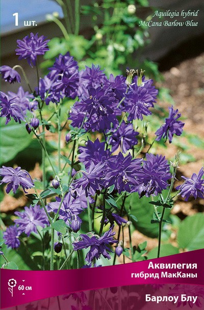 Аквилегия – многолетнее растение с оригинальной формой цветков. Цветы трехлепестковые, со шпорами, похожи на колокольчик. В зависимости от сорта могут быть разных цветов, а также двуцветные, махровые. Месторасположение: аквилегии лучше чувствуют себя в полутени, однако их можно высаживать и на хорошо освещенные места. Здесь растения несколько мельчают и слабеют, а период цветения укорачивается. Почва: хорошо развивается на умеренно влажных, легких и рыхлых, богатых гумусом и питательными веществами почвах. Посадка: низкорослые формы сажают на расстоянии 25см друг от друга, более высокие – до 40см. Размножение: семенами и делением куста. Цветение: цветет с мая по июль. Использование: используется во всех видах цветочных оформлений: миксбордерах, групповых посадках. Гибриды МакКаны - высокорослые, до 120см, растения, полученные в результате многочисленных скрещиваний и собравшие в себе разнообразные признаки родительских видов и форм. Цветки преимущественно длинношпорцевые с различной расцветкой чашелистиков и лепестков венчика: голубые, синие, светло-фиолетовые, белые, желтые, розовые, красные и темно-красные. Они почти никогда не бывают поникшими. Барлоу Блу – высота растения 60см, цветки голубые. Цветение июнь. Похожие товары