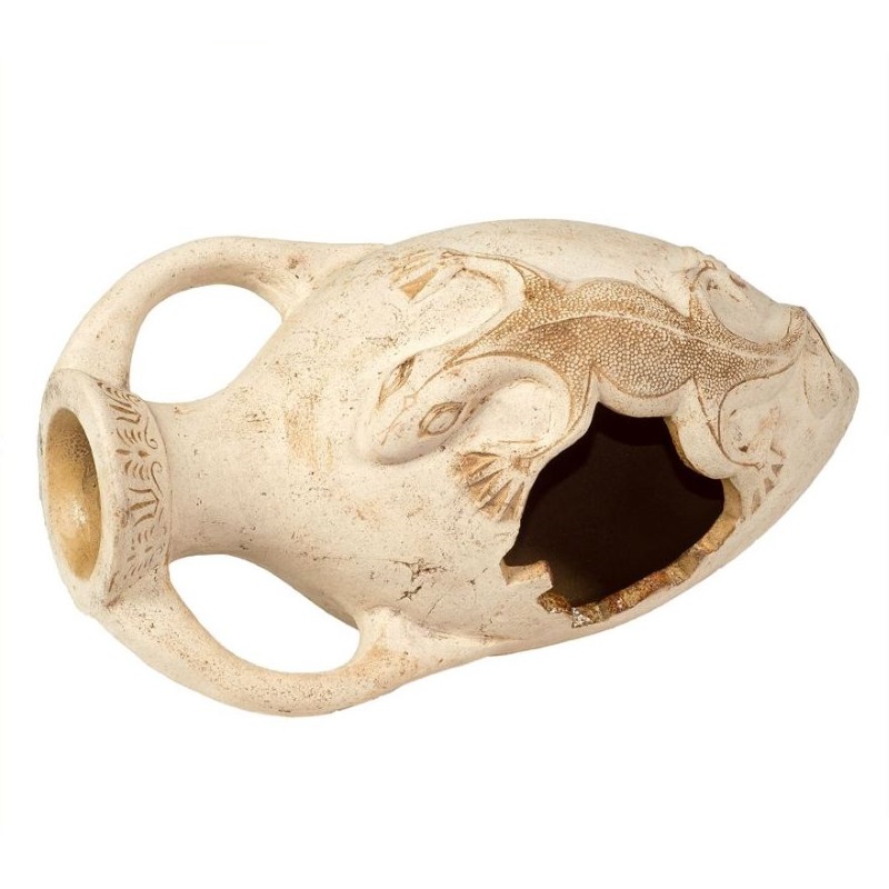 Фигура для сада изготовлена из шамотной глины высокотемпературного обжига. Покрыта специальной кварцевой глазурью. Выполнена в бежевом цвете с коричневым в области декора. Декорирована узорами из линий, имитирующими лёгкие трещинки под старину, орнаментом в верхней части и изображением бегущей ящерицы в центральной части сосуда. Фигура для сада по форме напоминает древнегреческий сосуд - амфору с конусообразным низом и гладкими ручками, лежащую на боку с отколовшимся небольшим куском. Похожие товары