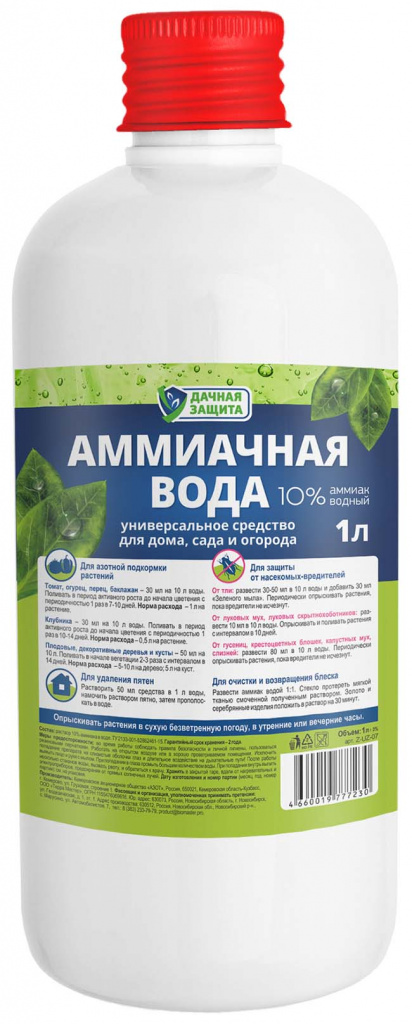 Для защиты от насекомых-вредителей От тли: развести 30-50 мл в 10 л воды и добавить 30 мл «Зеленого мыла». Периодически опрыскивать растения, пока вредители не исчезнут. От луковых мух, луковых скрытнохоботников: развести 10 мл в 10 л воды. Опрыскивать и поливать растения с интервалом в 10 дней. От гусениц, крестоцветных блошек, капустных мух, слизней: развести 80 мл в 10 л воды. Периодически опрыскивать растения, пока вредители не исчезнут. Для азотной подкормки растений Томат, огурец, перец, баклажан – 30 мл на 10 л воды. Поливать в период активного роста до начала цветения с периодичностью 1 раз в 7-10 дней. Норма расхода – 1 л на растение. Клубника – 30 мл на 10 л воды. Поливать в период активного роста до начала цветения с периодичностью 1 раз в 10-14 дней. Норма расхода – 0,5 л на растение. Плодовые, декоративные деревья и кусты – 50 мл на 10 л. Поливать в начале вегетации 2-3 раза с интервалом в 14 дней. Норма расхода – 5-10 л на дерево; 5 л на куст. Для очистки и возвращения блеска Развести аммиак водой 1:1. Стекло протереть мягкой тканью смоченной полученным раствором. Золото и серебряные изделия положить в раствор на 30 минут. Для удаления пятен Растворить 50 мл средства в 1 л воды, намочить раствором пятно, затем прополоскать в воде. icon_3.png Когда использовать Использовать круглый год. Похожие товары