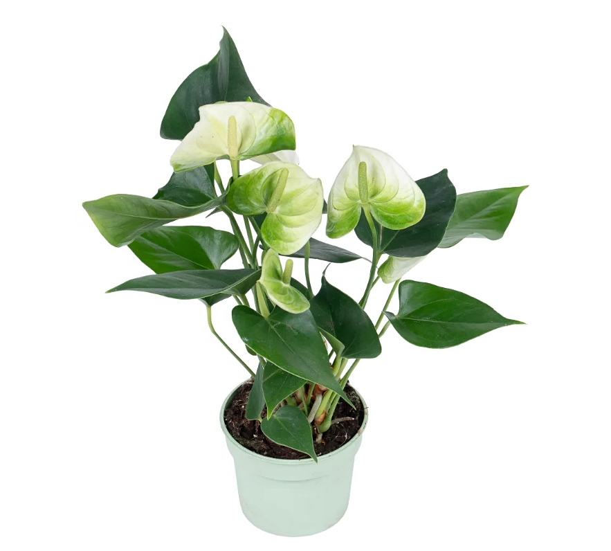 Цветок имеет короткий ствол, а его листья овальной формы. У белых сортов соцветие — это начало, которое в длину вырастает до 9 сантиметров, а его прицветник имеет более сердцевидную форму, и разную окраску. В диаметре прицветники Антуриума вырастают до 20 см. Похожие товары