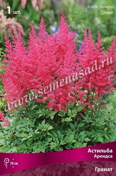 Астильбы – многолетние корневищные травянистые растения с отмирающей на зиму надземной частью. Стебли прямостоячие, высота в зависимости от вида - до 200см. Своими красками и формами эти растения оживляют светло-тенистые места в саду. Цветки розовые, светло-розовые, карминовые, красные, красно-фиолетовые, сиреневые, кремовые или белые в зависимости от сорта. Многочисленные цветочки собраны в крупные ажурные метелки. Характер роста кустовидный, от прямого до раскидистого. Месторасположение: оптимальная освещенность - разреженная тень или затенение в самое жаркое время дня. Не переносит мест с сухим воздухом. Почва: удобренная, глинисто-навозная. Размножение: делением кустов ранней весной раз в 4-5 лет. Цветение: цветет с конца июня до начала августа. Использование: астильбы — прекрасные растения для озеленения. Их можно высаживать моногруппами вблизи кустарников. А одиночные вкрапления астильбы выглядят особенно элегантно среди посадок декоративных хвойных. Лучше всего чувствуют себя у водоемов или во влажных полутенистых местах. Астильба Арендса – гибридная группа, включающая многолетние растения до 100см высотой, с мощным, деревянистым ветвистым корневищем и шнуровидными корнями. Форма куста — раскидистая, пирамидальная или шаровидная, до 70см в поперечнике. Цветки мелкие разнообразной окраски, белой, розовой, красной или сиреневой, собраны в изящные конечные соцветия. Цветет в июле-августе 30-40 дней. Гранат – высота растения 70см, цветки розово-красные, насыщенные. Похожие товары