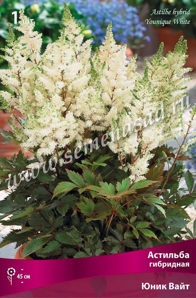Астильбы – многолетние корневищные травянистые растения с отмирающей на зиму надземной частью. Стебли прямостоячие, высота в зависимости от вида - до 200см. Своими красками и формами эти растения оживляют светло-тенистые места в саду. Цветки розовые, светло-розовые, карминовые, красные, красно-фиолетовые, сиреневые, кремовые или белые в зависимости от сорта. Многочисленные цветочки собраны в крупные ажурные метелки. Характер роста кустовидный, от прямого до раскидистого. Месторасположение: оптимальная освещенность - разреженная тень или затенение в самое жаркое время дня. Не переносит мест с сухим воздухом. Почва: удобренная, глинисто-навозная. Размножение: делением кустов ранней весной раз в 4-5 лет. Цветение: цветет с конца июня до начала августа. Использование: астильбы — прекрасные растения для озеленения. Их можно высаживать моногруппами вблизи кустарников. А одиночные вкрапления астильбы выглядят особенно элегантно среди посадок декоративных хвойных. Лучше всего чувствуют себя у водоемов или во влажных полутенистых местах. Астильба гибридная – это самая многочисленная группа, ее составляют те астильбы, которые не могут быть распределены в другие группы. Юник Вайт – высота растения 45см, цветки белые, куст компактный. Цветение июнь-июль. Похожие товары