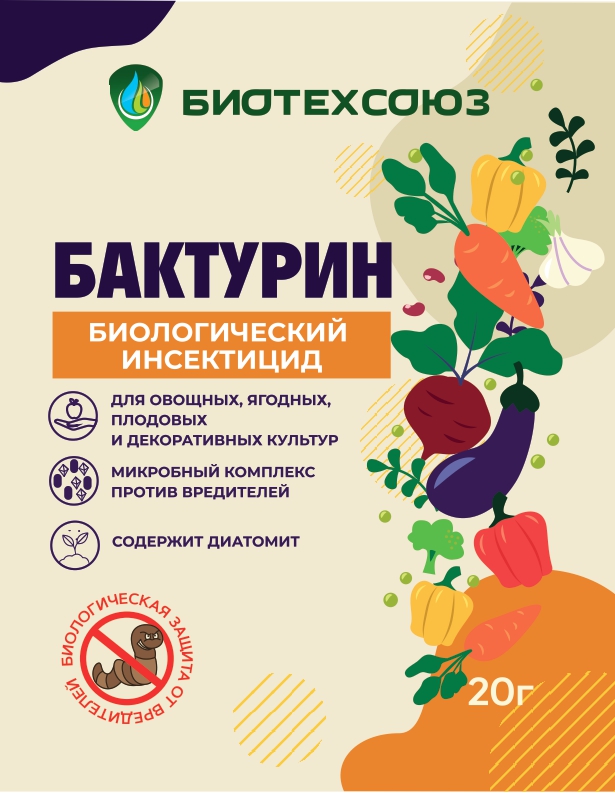 Биологический инсектицид Для защиты овощных, плодовых, ягодных, цветочных культур от личинок насекомых-вредителей. Препарат защищает растения от гусениц и личинок молодого возраста различных видов насекомых: совок, плодожорок, листоверток, молей, белянок, волнянок,шелкопрядов, пядениц; от личинок молодого возраста колорадского жука и пилильщиков, листоедов; в том числе и другие листогрызущие фазы развития насекомых в возрасте до 3-4 линьки. Состав: жизнеспособные споры Bacillus thuringiensis штаммы S-857, S-859. Препаративная форма: смачивающийся порошок. Содержит диатомитовый порошок-почвоулучшитель. Применение/Норма внесения: 20г препарата развести в 1л теплой воды (+20-+30 градусов). Перемешать и выдержать 5-10мин. Полученный раствор разбавить водой до 10л и использовать. Препарат применяют в любую фазу развития растений. Опрыскивание растений проводить в утренние или вечерние часы, в сухую безветренную погоду, смачивая листья с обеих сторон. Желательно использовать прилипатель. Последняя обработка - за 5 дней до сбора урожая. Использовать рабочий раствор в течение суток. Томат, перец, баклажан, огурцы и др.овощи: 3-4 обработки с интервалом 5-7 дней. Плодовые деревья и кустарники, цветочные и декоративные растения: 4 обработки с интервалом 5-7 дней. Похожие товары