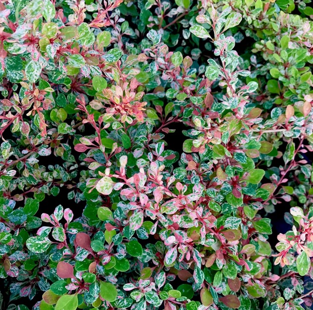 Барбарис Тунберга Наташа - декоративность высокая, идеально для формирования живой изгороди, высота 1,0 м и ширина 1,0 м, рост медленный, форма сферическая. Окраска листьев розово-белая-зеленая, к осени розово-красные. Зацветает в мае небольшими кремовыми цветками, ягоды красные. Похожие товары