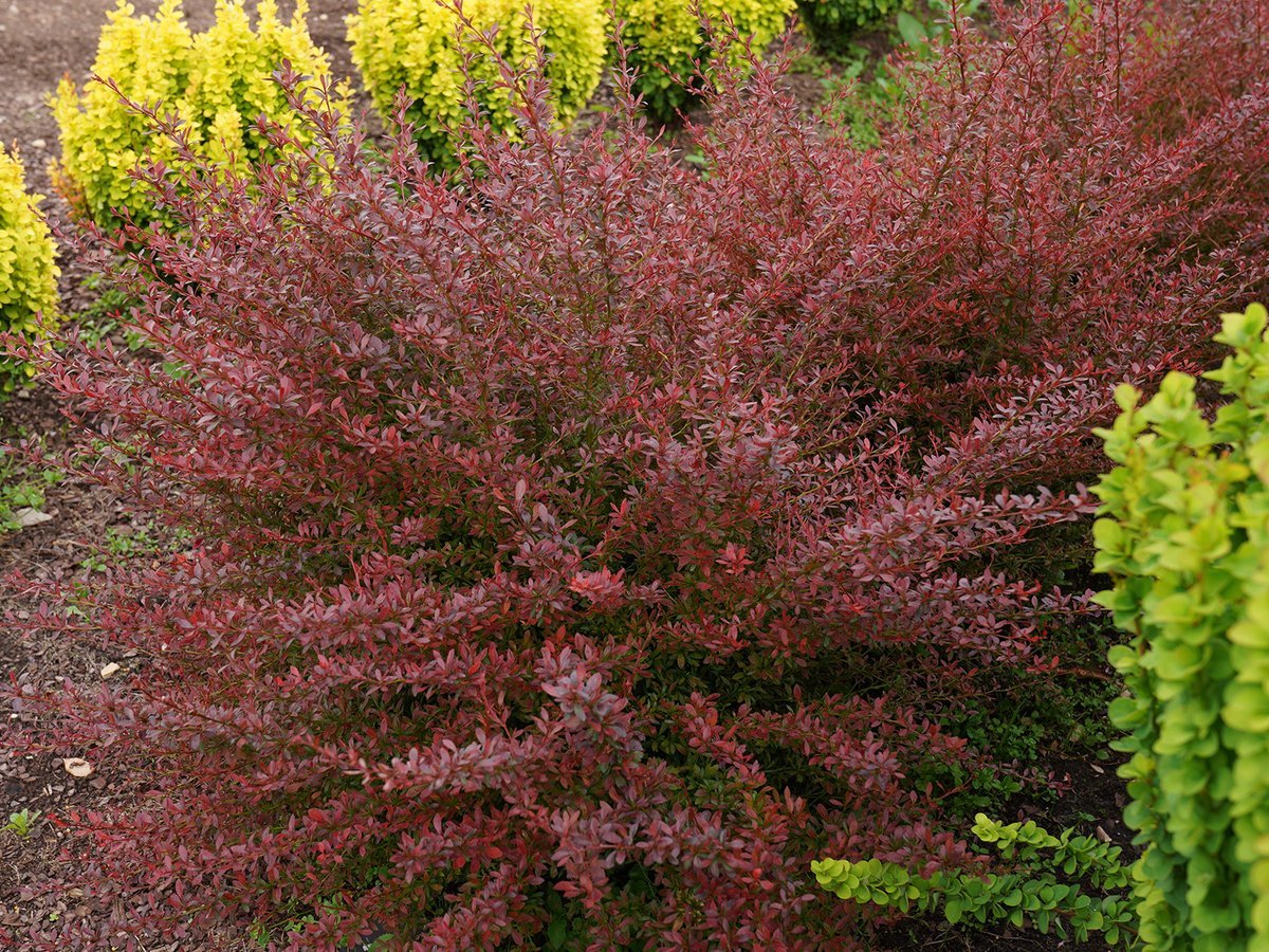 Барбарис Тунберга Ред Дрим - изящный раскидистый кустарник до 0,6м. Растет медленно, годовой прирост 10см. Листья мелкие, овально-яйцевидные темно-красного цвета с бордовым оттенком. Ветви раскидистые, длинные, с темно-коричневой корой и острыми шипами. Цветет многочисленными желтыми мелкими цветками в мае-июне. Плоды продолговатые, кораллово-красные, блестящие, созревают в начале осени и долго держатся на кусте. Предпочитает солнечное местоположение. Устойчив к засухе, условиям города. Хорошо стрижется. Похожие товары
