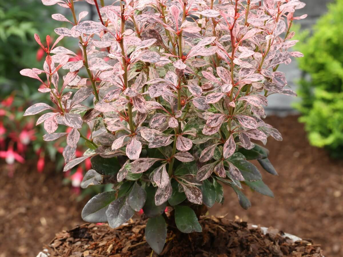 Барбарис Тунберга Рози Рокет - Вертикально растущий кустарник высотой до 1,3м и шириной до 0,6м. Листья пестрые, розово-красные со светлыми пятнами, имеют округлую форму. Цветет в конце мая бледно-желтыми цветами, собранными в кистевидные соцветия. Красные, мелкие плоды созревают в сентябре. Похожие товары