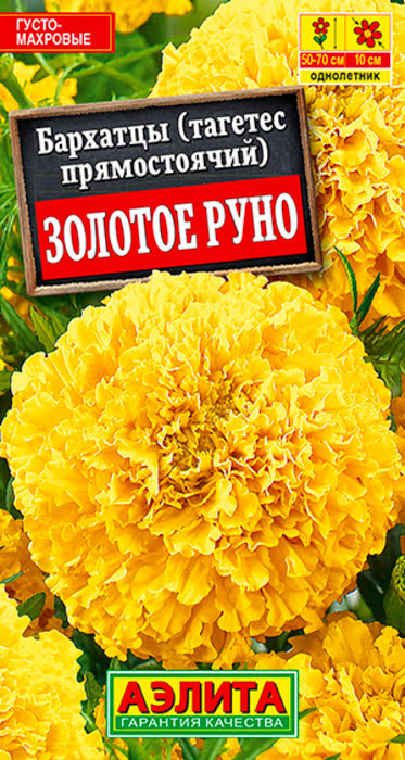 Бархатцы Золотое руно прямостоячие - это крупноцветковый сорт. Кусты прямостоячие, хорошо разветвленные, сильно облиственные, высотой 50-60 см. Зацветают через 2,5 месяца от посева. Соцветия густомахровые, гвоздиковидные, душистые, O 10 см. Сорт рекомендуется для оформления цветников и на срезку. Бархатцы выращивают рассадным способом. Посев проводят в первой половине апреля. Всходы появляются через 4-8 дней после посева, сеянцы пикируют в фазе 1-2-х настоящих листьев. Рассаду высаживают в конце мая-начале июня. Возможен посев семян в открытый грунт в мае на глубину 1,5-2 см. Похожие товары