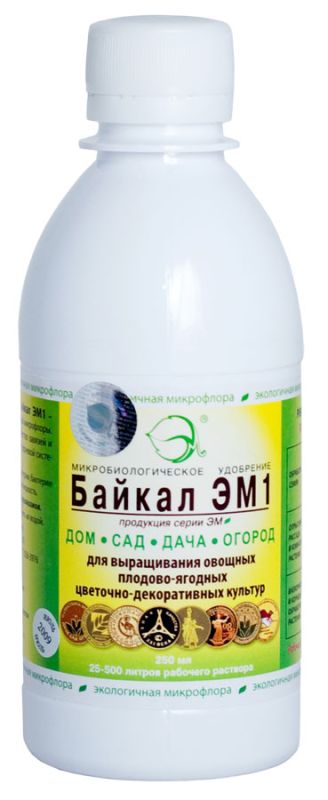 «Байкал ЭМ1» - готовое к применению микробиологическое удобрение, содержащее симбиотический саморегулирующийся комплекс специально отобранных природных живых микроорганизмов: молочнокислые и фотосинтезирующие бактерии, бактерии, фиксирующие азот, сахаромицеты, продукты их жизнедеятельности и культуральную жидкость. В отличие от концентрата, из которого получается в домашних условиях аналогичный по свойствам продукт, готовый водный раствор культивируется промышленным способом. Байкал ЭМ1 заметно улучшает свойства почвы, помогает вырастить экологически безопасный урожай и сохраняет природные взаимосвязи между землей и растениями. Не содержит генномодифицированные микроорганизмы. Микробиологическое удобрение «Байкал ЭМ1»: - способствует активной фиксации атмосферного азота микроорганизмами, обитающими в корневой системе растений (ризосфере); - превращает связанные органические и минеральные химические элементы в растворимые формы, усваиваемые растениями в процессе роста и развития; - повышает фотосинтезирующую способность растений; - стимулирует физиологические процессы, протекающие в растительной клетке, что приводит к ускоренному развитию вегетативных органов, более раннему завязыванию и созреванию плодов; - позволяет уменьшить расходы и обеспечивает экономию средств по сравнению с традиционными технологиями; - способствует производству экологически безопастной продукции и возрождению почв; - предотвращает уплотнение почвы при нулевой системе обработки (No Till); «Байкал ЭМ1» предназначен для: - предпосевной обработки семян и всходов; - осенней и весенней подготовки почвы; - полива или опрыскивания растений на орошаемых площадях, в открытом и защищенном грунте; - приготовления биоорганоминерального удобрения на основе дефеката; - приготовления ЭМ-компоста из органического сырья; - приготовления ЭМ-ургасы - продукта переработки домашних пищевых отходов; - приготовления ЭМ-экстракта; - реабилитации городских почв в садах и парках; Эффективность применения: - восстанавливает и поддерживает плодородие различных типов почв; - повышает энергию прорастания и всхожесть семян (в т.ч. трудновсхожих); - увеличивает урожайность сельскохозяйственных культур; - повышает продуктивность посевов; - снижает потребность растений в минеральных удобрениях и ядохимикатах; - укрепляет иммунитет, снижает негативное воздействие патогенных микроорганизмов, усиливает морозо- засухоустойчивость растений ; - улучшает качество и сохранность производимой продукции; - нормализует экологическую обстановку, не нарушая естественные связи, сформировавшиеся в экосистеме; Микробиологическое удобрение "БАЙКАЛ ЭМ1" позволяет получить следующие результаты: - Повысить на 15-40% биологическую (азотфиксирующую) активность почвы, улучшить ее физико-химические показатели; - Снизить нормы внесения минеральных удобрений (от 50 % ); - Получить прибавку урожая. По результатам многолетних промышленных испытаний в различных почвенно-климатических регионах России - до 10 ц/га для зерновых культур, до 60 ц /га для картофеля и свеклы, до 6ц/га для сои, до 20 ц/га для кукурузы и подсолнечника; - Снизить заболеваемость растений (особенно бактериальными и вирусными болезнями) на 19-65%; - Улучшить качество продукции: повысить содержание клейковины зерновых на 3%, сахари