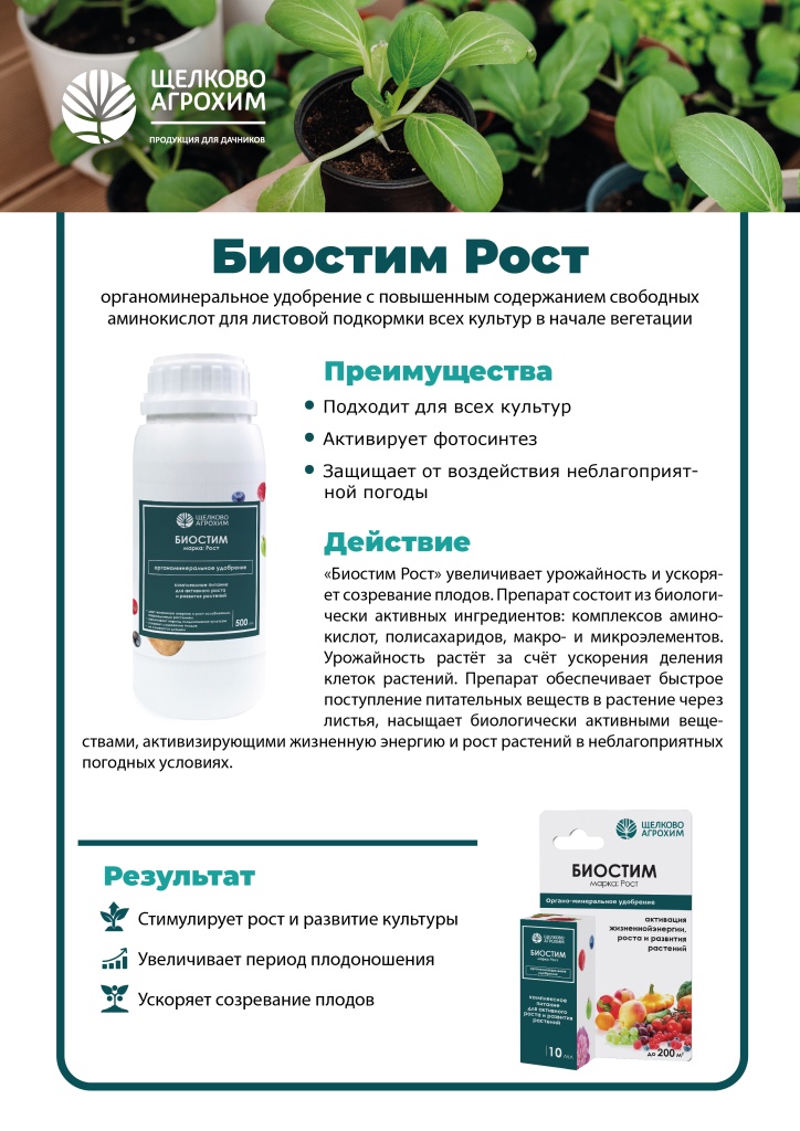 Для чего и где применять: Для активизации жизненных сил и возрождения ослабленных растений. Преимущества: Стимулирует рост и развитие культуры. Увеличивает период плодоношения . Ускоряет созревание плодов. Действие: Обеспечивает сбалансированным составом аминокислот растительного происхождения для питания растений. Экология и безопасность: 4 класс опасности (малоопасное) Срок и to хранения: 3 года, от -0 до +35oС Результат: Стимулирует рост и развитие культуры Увеличивает период плодоношения Ускоряет созревание плодов ПЕРИОД ПРИМЕНЕНИЯ апрель-июнь Похожие товары