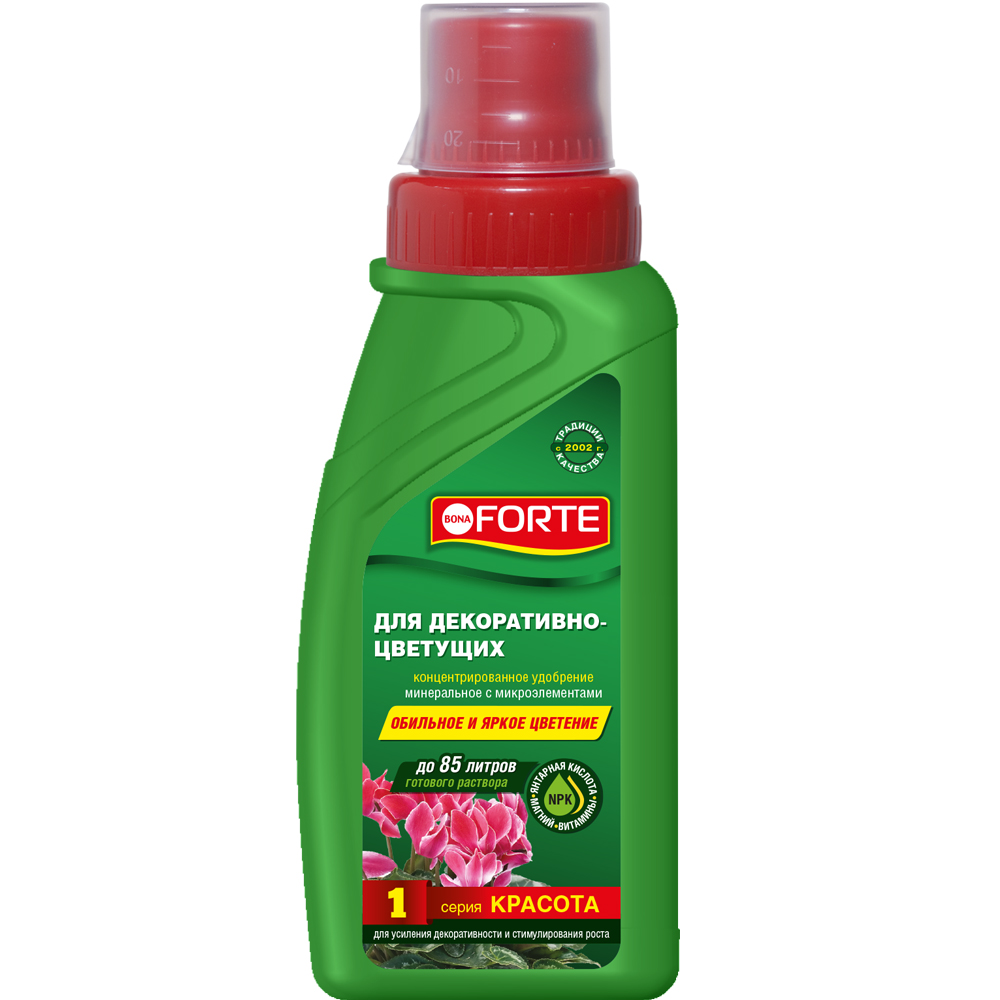Bona Forte (Бона Форте) является комплексным удобрением, выпускаемым в жидком состоянии. В его состав входит комплекс питательных элементов, которые в равной мере подкармливают растения и улучшают его декоративные свойства. В удобрении находятся: 3%- магния, 5% - калия, и 7% - фосфора. Магний – это главный питательный элемент. В хелатном состоянии в удобрении находятся 6 микроэлементов. Они представлены кобальтом, железом, цинком, медью, марганцем и молибденом. Кроме них в жидкости находится бор и медь. Витаминный комплекс представлен тремя элементами: C, PP и B1. Янтарная кислота в Бона Форте (Bona Forte) является главным стимулятором роста. Этот любимый напиток растений предназначен для - полноценной и сбалансированной подпитки растений, учитывая их специфические потребности и особенности в осенний сезон. Это происходит благодаря высокой концентрации фосфора и калия (12%). - Повышенной устойчивости растений к неблагоприятным условиям, которая достигается при помощи Mg в концентрации 0,3%. - Полноценной усвояемости полезных элементов и длительного их воздействия. Достигается с помощью хелатных микроэлементов. - Повышения и укрепления иммунитета растений, благодаря витаминному комплексу подкормки. Похожие товары