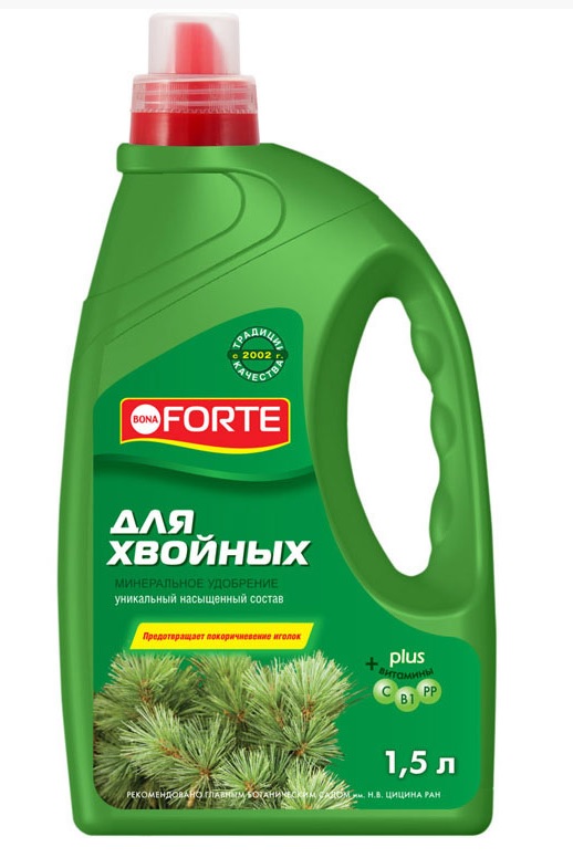 Комплексное жидкое средство Бона Форте для хвойных рекомендуется в качестве основного питания вечнозеленых растений: сосен, елей, туй, можжевельника, кедра, кипарисов, лиственницы. Препарат сдерживает покоричневение хвои, наполняет зеленью иголки, повышая иммунитет. Средство включает в себя необходимый баланс веществ для правильного содержания хвойных. Удобрение Бона Форте для хвойных растений активизирует развитие и рост корней. Похожие товары