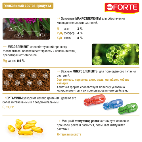 ОБЕСПЕЧИВАЕТ ПРОДОЛЖИТЕЛЬНОЕ И ПЫШНОЕ ЦВЕТЕНИЕ СТИМУЛИРУЕТ ОБРАЗОВАНИЕ БУТОНОВ ПРИДАЕТ НАСЫЩЕННУЮ ОКРАСКУ ЦВЕТКОВ УСКОРЯЕТ НАЧАЛО ЦВЕТЕНИЯ Похожие товары