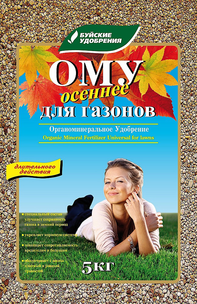 Буйские удобрения органо-минеральное удобрение (ОМУ) Газонное осень предназначено для основной заправки почвы при закладке газонов, спортивных и декоративных травяных полей, кортов, а также для их подкормок в течение вегетации. Уникальность этого Буйского удобрения заключается в том, что оно сочетает в себе лучшие свойства как органических, так и минеральных удобрений. В процессе получения удобрения минеральные элементы питания образуют с гуминовыми соединениями органоминеральные комплексы, позволяющие закреплять азот в обменной форме и уменьшать его подвижность, а фосфор и калий переводить в форму легко усвояемую растениями. За счет этого коэффициент использования питательных элементов из удобрения достигает 95% Буйское ОМУ "Газонное"осень способствует: — Сбалансированному питанию макро- и микроэлементами. — Увеличению прочности травостоя. — Улучшению агрофизических свойств почвы, её структуры, воздухо- и водопроницаемости. — Мелко гранулированный состав позволяет провести равномерное внесение удобрения. Похожие товары