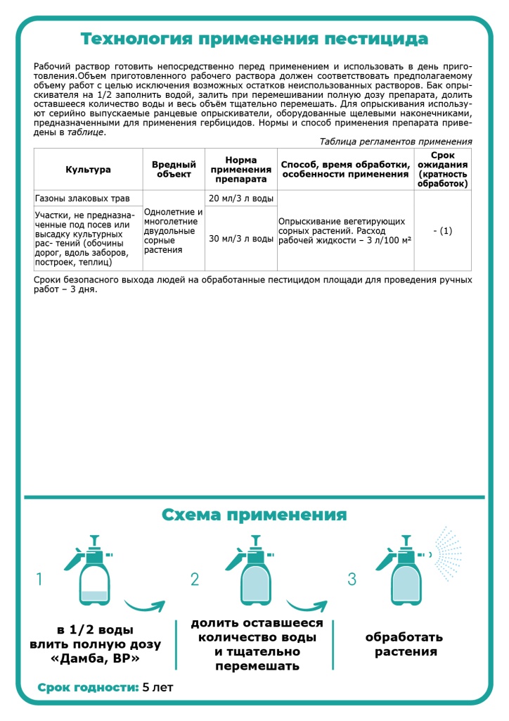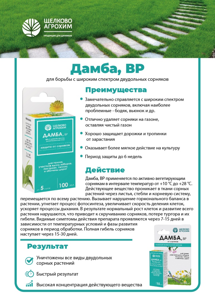 Действие «Дамба, ВР» – средство для борьбы с широким спектром двудольных сорняков на газонах и участках, не предназначенных под посев культурных растений. Дамба, ВР применяется по активно вегетирующим сорнякам в интервале температур от +10 °С до +28 °С. Максимально рекомендованная норма расхода препарата используется при высокой засоренности и по переросшим сорнякам. Опрыскивание производится в утренние или вечерние часы в безветренную погоду, чтобы препарат не попал на соседние культуры. Не проводить обработку при обильной росе или если в ближайшие 4 часа ожидается дождь. Результат Уничтожены все виды двудольных сорных растений Быстрый результат Высокая концентрация действующего вещества Рекомендации по применению Дамба, ВР применяется по активно вегетирующим сорнякам в интервале температур от +10 °С до +28 °С. Максимально рекомендованная норма расхода препарата используется при высокой засоренности и по переросшим сорнякам. Опрыскивание производится в утренние или вечерние часы в безветренную погоду, чтобы препарат не попал на соседние культуры. Не проводить обработку при обильной росе или если в ближайшие 4 часа ожидается дождь. Полезно знать: Видимые симптомы действия препарата проявляются через 7-15 дней в зависимости от температурных условий и фазы развития сорняков в период обработки. Полная гибель сорняков наступает через 15-30 дней. Безопасность и экология 3 класс опасности (умеренно опасное) Период применения апрель - июнь Температура хранения от -30 °C до +40°С Срок годности 5 лет Похожие товары