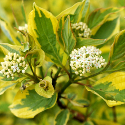 Дерен белый Шпети (Cornus alba Spaethii) - кустарник до 2,5м высотой и до 3м шириной, с тонкими, гибкими, кораллово-красными или красно-бурыми, направленными вверх ветвями. Листья при распускании коричневато-оранжевые, летом зеленые, неравномерно окаймленные по всему периметру широкой золотистой полосой, снизу - сизовато-белые, широкояйцевидные до 8см длиной, осенью красно-фиолетового цвета. Похож на дерен белый Гоучалти, который в отличии от данного сорта, имеет по краям листьев желтые и розовые цвета. Цветет в июне, в течение 15-20 дней, желто-белыми мелкими цветками, собранными в плотные полушаровидных соцветиях, диаметром до 5см. Растет быстро, до 50 см в год. Зимой декоративно смотрятся красные побеги на фоне белого снега. Быстро отрастает, переносит обрезку, идеально подходит для живых изгородей. Хорошо переносит морозные зимы. Похожие товары