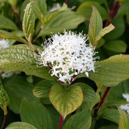 Дёрен белый Сибирика (Cornus alba Sibirica) - кустарник до 3 м высотой с тонкими, гибкими, кораллово-красными или красно-бурыми, направленными вверх ветвями. Листья зеленые, яйцевидно-ланцетные до 12см длиной, осенью от яркого желто-оранжевого до красно-фиолетового цвета. Цветет с начала июня - до конца июня, в течение 15-20 дней, желто-белыми мелкими цветками, собранными в плотные полушаровидные соцветия, диаметром до 5см. Растет быстро, до 50 см в год. Зимой декоративно смотрятся красные побеги на фоне белого снега. Быстро отрастает, переносит обрезку, идеально подходит для живых изгородей. Хорошо переносит морозные зимы. Похожие товары