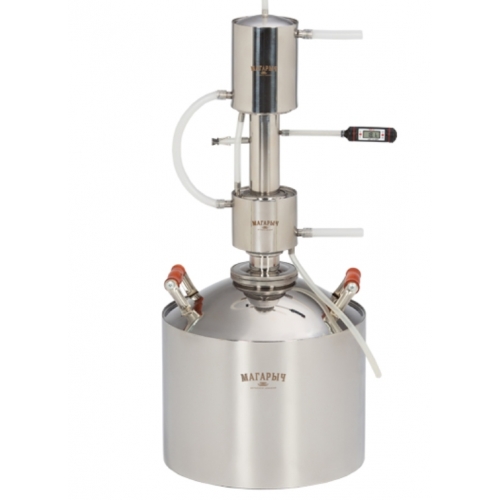 Самогонный аппарат-дистиллятор "Магарыч Машковского Экспорт БКДР" на 12 л обеспечивает скорость перегонки спирта до 2 литров в час. Оснащен сухопарником в виде колонны-дефлегматора, в котором производится качественная очистка паров спирта. В конструкции имеется доохладитель, благодаря чему "на выход" подается холодный продукт. Все рабочие элементы аппарата сделаны из миллиметровой нержавеющей стали, а ручки изготовлены из дерева, что придает ему стильный внешний вид. При желании можно дооснастить дистиллятор термометром, для которого предусмотрено специальное крепление. Прибор легко собирается, разбирается и моется, запатентован и произведен в России. Похожие товары