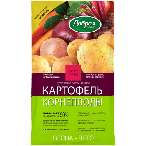 Удобрение рекомендовано для всех видов корнеплодов: картофеля, моркови, свеклы, редиса, репы, редьки, дайкона, сельдерея, брюквы, турнепса, петрушки, пастернака, цикория, скорцонеры. Удобрение обогащено цеолитами, содержащими биодоступный кремний. Доля цеолитов в составе удобрения – до 70%, что обеспечивает сильный стимулирующий эффект, защищает растения и плоды от вредного воздействия окружающей среды, увеличивает длительность хранения плодов. Удобрение содержит основные элементы питания в легкоусвояемой форме и сбалансированном соотношении, способствует хорошему росту растений и получению высокого урожая. КАК ИСПОЛЬЗОВАТЬ Основное внесение – удобрение равномерно рассыпают по поверхности почвы и проводят вспашку или перекопку, или рыхление. При посеве и посадке. Удобрение вносят в рядки или лунки и перемешивают с почвой. Подкормки – удобрение равномерно распределяют между рядами растений (в междурядьях) или по поверхности почвы с последующей заделкой удобрений рыхлением. После подкормок растения рекомендуется обильно полить. Картофель – подкормка до начала цветения 1-2 раза с интервалом 10-15 дней. Овощные культуры – подкормка через 2 недели после появления всходов или высадки рассады 1-2 раза с интервалом 10-15 дней. СОСТАВ Три основных макроэлемента (NPK): азот (N) – 2,5 %, фосфор (P2O5) – 4 %, калий (K2O) – 4 % Питательный макроэлемент (Si): кремний (Si) – 18 % Семь микроэлементов: кальций, магний, бор, марганец, цинк, молибден, титан. Микроэлементы находятся в хелатной (легкоусвояемой) форме. Похожие товары