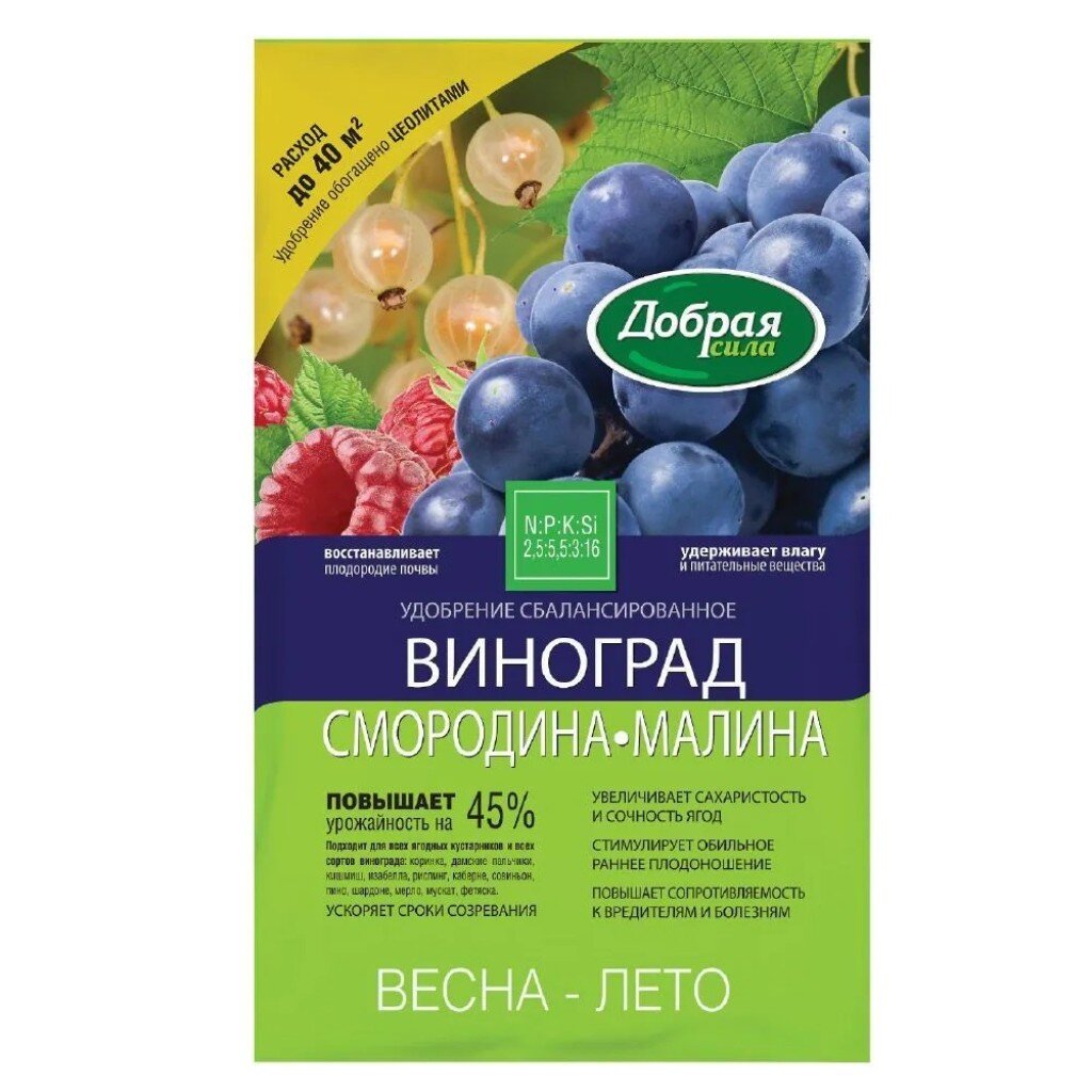 Удобрение рекомендовано для всех сортов винограда и ягодных кустарников: коринка, дамские пальчики, кишмиш, изабелла, рислинг, каберне, совиньон, пино, шардоне, мерло, мускат, фетяска. Доля цеолитов в составе удобрения — до 70%, что обеспечивает сильный стимулирующий эффект, защищает растения и плоды от вредного воздействия окружающей среды, увеличивает длительность хранения плодов. Похожие товары