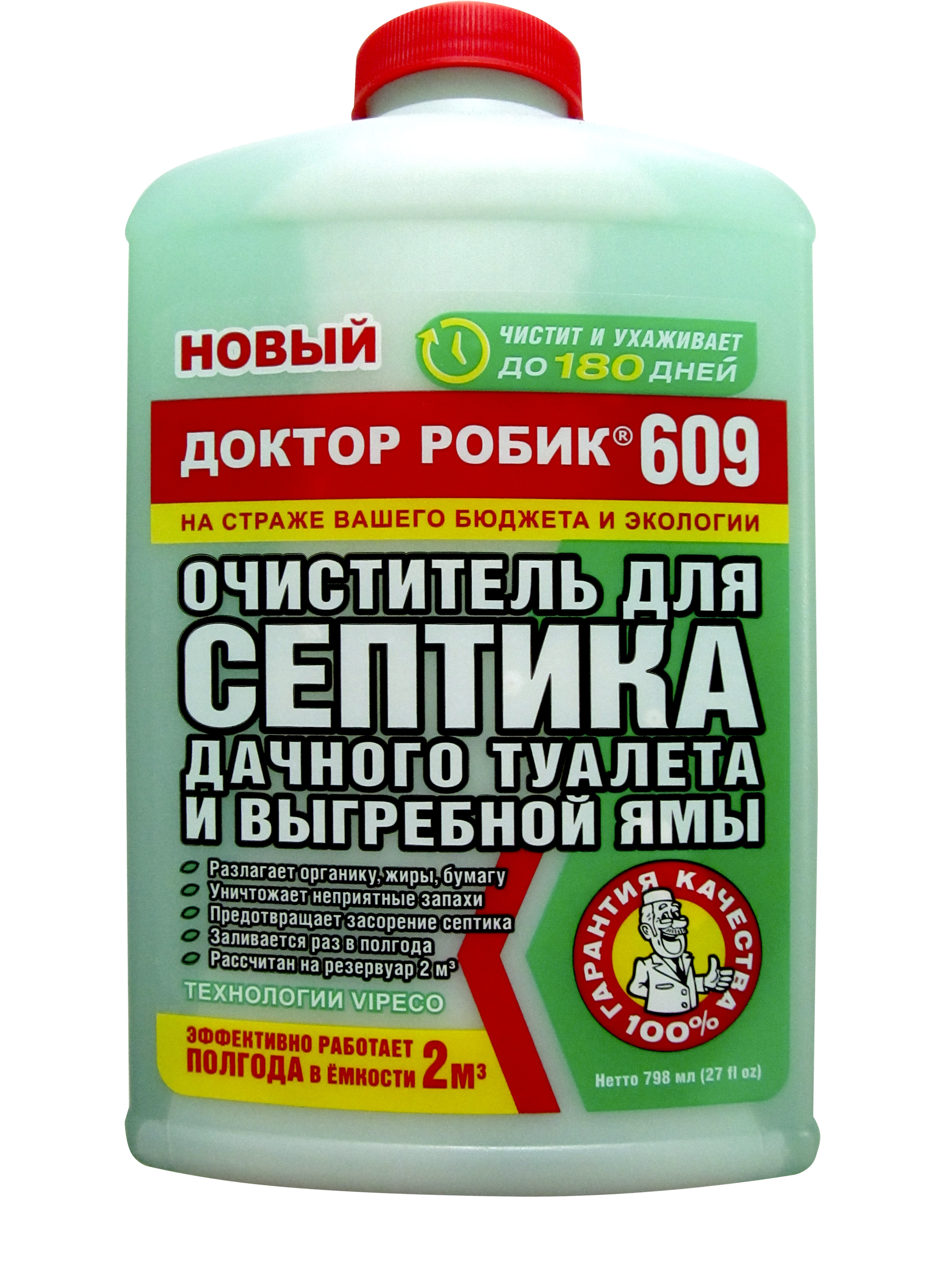 Очиститель для септика, дачного туалета и выгребной ямы Доктор Робик 609 – средство для очистки и ухода за выгребными ямами и септиками, чистит и ухаживает до 180 дней. Разлагает органику, жиры, бумагу. Уничтожает неприятные запахи. Предотвращает засорение септика. Заливается раз в полгода. Рассчитан на резервуар 2 м?. Доктор Робик 609 разработан для разжижения густых масс, окаменелостей, очищает поры в земле и уменьшает слой ила, удаляет неприятные запахи. Разлагает белки, жиры, бумагу, крахмал, мочевину. В течение короткого времени восстанавливает нормальную работу канализационных систем. Состав: природные штаммы почвенных микроорганизмов в спорах, ферменты. Перед применением хорошо взболтать, залить в унитаз, спустить воду. Или напрямую в септик, выгребную яму. Флакон рассчитан на однократное применение на емкость с объемом 2000 л, сроком от 150-180 дней. Максимальный эффект может быть достигнут после откачки и промывки системы. Рекомендуется использовать в течение 2-х лет с даты изготовления. Может содержать осадок. Меры предосторожности: Безопасен для людей, животных, растений. Беречь от детей. Не принимать вовнутрь. Похожие товары