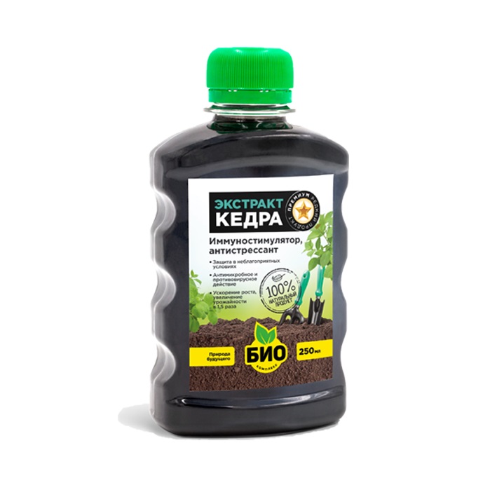 Водный экстракт кедра сибирского. Состав: фенолокислоты, терпеноиды, флавоноиды, лигнаны, фитостерины, витамины A, С, D, Е, группы В, макроэлементы: K, Mg, Ca, P, S, микроэлементы: Al, Si, Mn, Fe, Cu, Co, Zn, большое количество биологически активных веществ Свойства: Улучшает обмен веществ и выработку фитогормонов, ферментов, витаминов Защищает от инфекционных и грибковых заболеваний Ускоряет рост, увеличивает урожайность в 1,5-2 раза Защищает от стрессовых факторов: перегрева, охлаждения, механических повреждений, переизбытка ультрафиолетового излучения Подходит для всех типов растений. Похожие товары