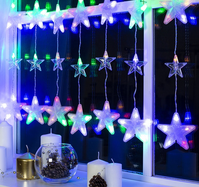 Применение: Внутреннее. Размер, м: 2.4 х 0.9. Насадки: Да. Вид насадки: Звёзды. Цвет свечения: Мульти. Вид лампы: Светодиодная. Количество ламп: 186. Режим работы гирлянды:Задаётся контроллером. Количество режимов: 8. Тип питания: От сети 220 В. Цвет нити гирлянды: Прозрачный. Материал нити: ПВХ. Похожие товары