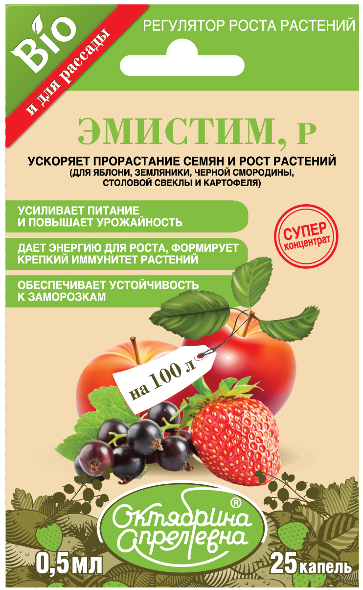Для чего и где применять: Регулятор роста растений. Уникальный регулятор роста растений широкого спектра действия с очень экономичной дозой применения. Продукт биотехнологического выращивания грибов-эпифитов из корневой системы лекарственных растений. Содержит сбалансированный комплекс (фитогормонов, аминокислот, углеводов, жирных кислот, микроэлементов). Преимущества: улучшает питание растений и увеличивает урожайность обеспечивает профилактику болезней, формируя крепкий иммунитет растений обладает антистрессовым эффектом, усиливая устойчивость к заморозкам Действие: Препарат повышает энергию прорастания и полевую всхожесть семян, раскрывает потенциал сорта, способствует ускоренному делению клеток, развитию более мощной корневой системы, увеличению площади листовой поверхности и содержанию хлорофилла. Препарат снижает фитотоксическое действие пестицидов, улучшает качество выращенной продукции, повышает устойчивость растений к стрессовым факторам, препарат усиливает действие пестицидов, активизирует «ген устойчивости» и иммунитет растения к болезням и вредителям. Экология и безопасность: 3 класс опасности (умеренно опасное) Срок и to хранения: 3 года, от -15 до +35oС Результат: Усиливает питание и повышает урожайность Обеспечивает устойчивость к заморозкам Дает энергию для роста, формирует крепкий иммунитет растений БЕЗОПАСНОСТЬ И ЭКОЛОГИЯ 3 класс опасности (умеренно опасное) ПЕРИОД ПРИМЕНЕНИЯ апрель-сентябрь Похожие товары