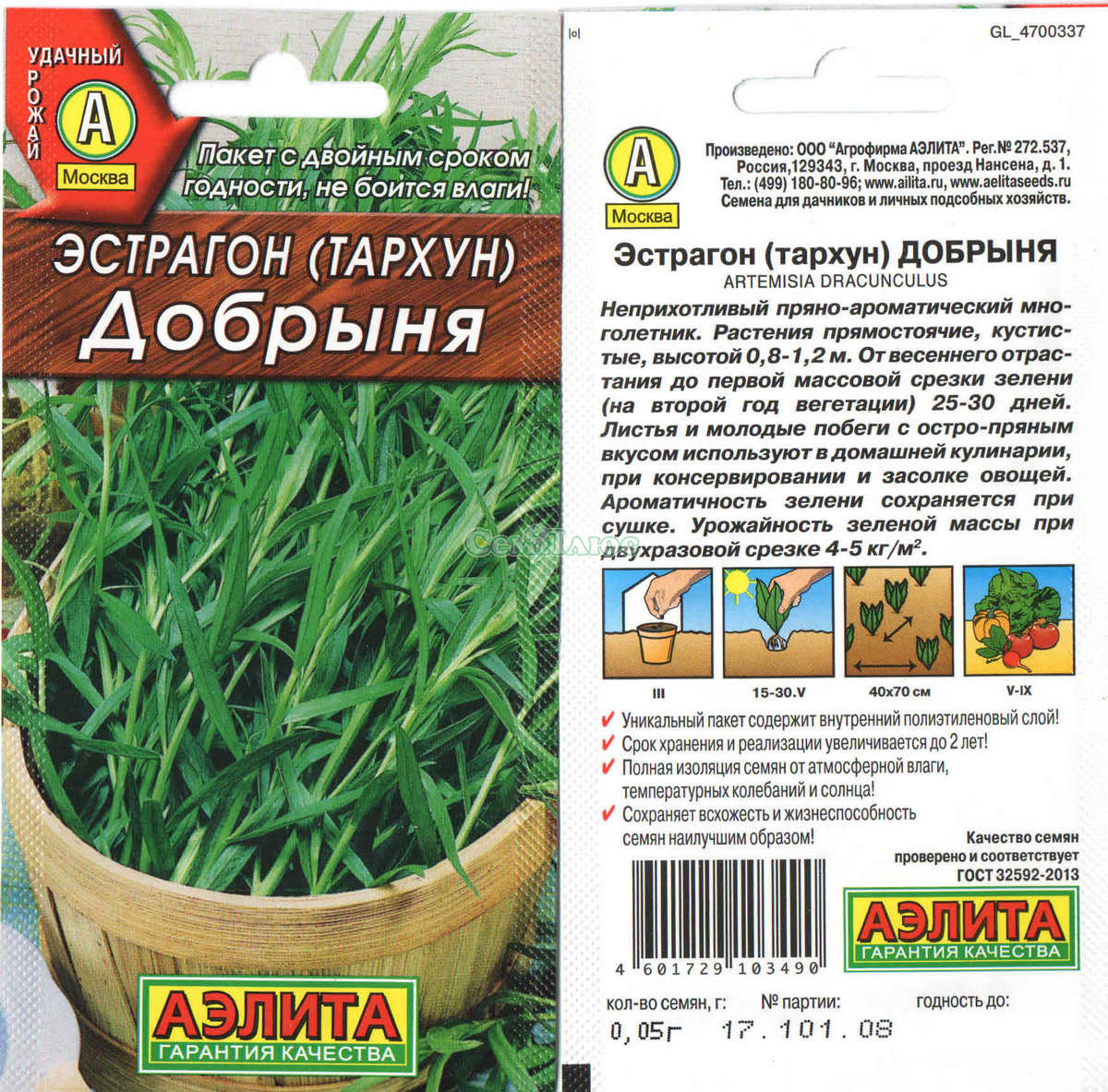 ?Неприхотливый пряно-ароматический многолетний полукустарник из рода полыней. Известен также под названием «тархун». Сорт формирует прямостоячие, кустистые растения с хорошо облиственными стеблями длиной около 1 м. Период от весеннего отрастания до первой массовой срезки зелени (на второй год вегетации) 25-30 дней. Сорт ценится за высокое содержание в зеленой массе аскорбиновой кислоты, каротина, эфирных масел. Ароматные листья и молодые побеги с освежающим, остро-пряным вкусом используют в домашней кулинарии, при консервировании и засолке овощей. Ароматичность зелени хорошо сохраняется при сушке. Урожайность зеленой массы при двухразовой срезке 4-5 кг/м2. Посев. Выращивают прямым посевом семян в открытый грунт или через рассаду. Посевы размещают на солнечных участках с легкими, хорошо дренированными почвами. Растения засухоустойчивые, холодостойкие, хорошо зимуют. Эстрагон может расти на одном месте 8-10 лет. Рекомендуется делить кусты каждые 2-3 года с целью омолаживания растений. Похожие товары