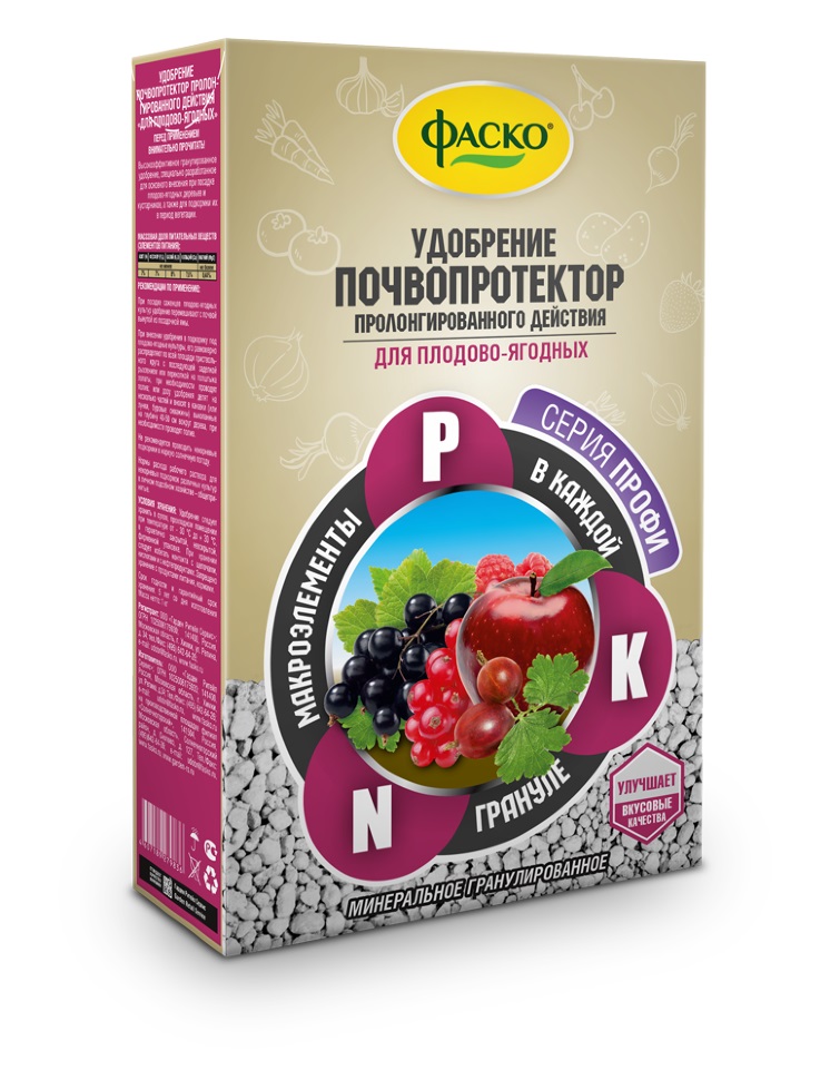 ГРАНУЛА – ПОЧВОПРОТЕКТОР (серия ПРОФИ) – Широкий набор микроэлементов в составе. Компоненты состава предотвращают эффект закисления и разрушения почвы, способствуют пролонгированному снижению ее кислотности и улучшению структуры верхнего плодородного слоя. Преимущества Одинаковый состав питательных элементов в каждой грануле Пролонгированное действие Восстановление верхнего плодородного слоя почвы Описание Минеральное удобрение "5М-гранула": каждая гранула содержит 5 питательных макро и микроэлементов. Обеспечивает равномерное и полноценное питание растений Гарантирует эффективность применения выше, чем дают обычные тукосмеси (подтверждено вегетативными опытами). Удобрение серии профи - обладает свойством почвопротектора, т.е. оказывают благоприятное воздействие на структуру почвы: - предотвращает эффект ее закисления и разрушение структуры в процессе использования - восстанавливает верхний плодородный слой - обладает пролонгированным действием. Применяется для основного внесения при посадке плодово-ягодных деревьев и кустарников, а также для подкормки их в период вегетации •Позволяет собирать богатые урожаи в течении длительного периода. • Не допускает попадания в плоды вредных веществ. •Вкусовые и качественные характеристики плодов не снижаются благодаря правильному уходу. Рекомендации по применению Плодовые культуры (семечковые): внесение при посадке - 90-150 г/м2; Плодовые культуры (семечковые): внесение в подкормку весной или осенью (первая подкормка не ранее, чем через 1 год после посадки) - 90-150 г/м2 приствольного круга. Похожие товары
