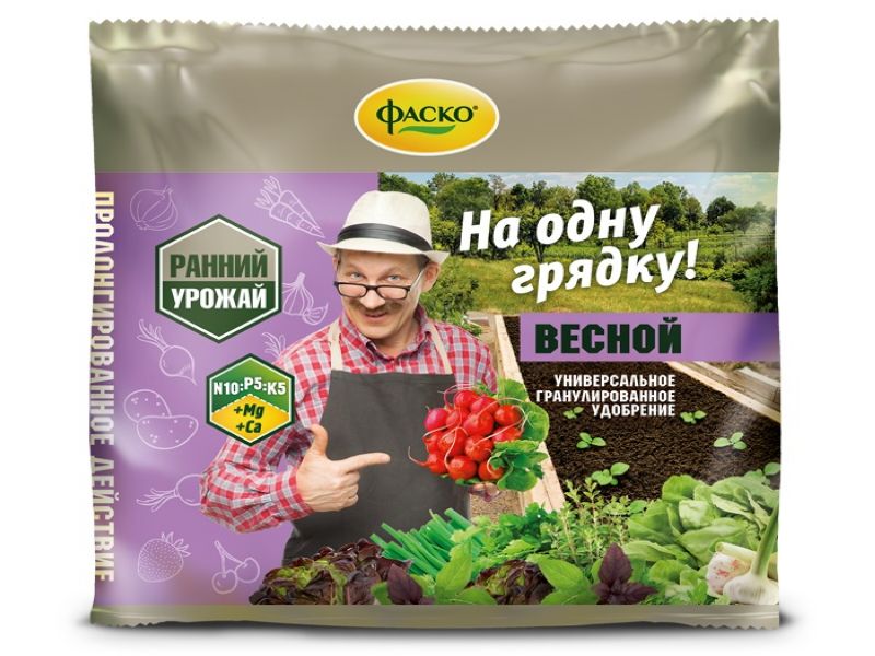 Высокоэффективное комплексное удобрение специально разработано для подкормки ранних сортов редиса, лука, чеснока, салата и прочих зеленных культур. Содержит все необходимые, для быстрого развития сильных растений и обильного плодоношения, питательные элементы. Внесение весной под перекопку (вспашку, рыхление) почвы: Овощные культуры (окультуренная почва) - 70-90 г/м2; Овощные культуры (неокультуренная почва) - 90-120 г/м2.Внесение при посадке: Плодово-ягодные культуры (косточковые) - 50 -70 г/растение.Внесение в подкормку весной или осенью (первая подкормка не ранее, чем через 1 год после посадки): Плодово-ягодные культуры (косточковые) - 50 -70 г/м2 приствольного; Смородина, жимолость - 40 -50 г/м2. Удобная упаковка: Одна упаковка на Одну грядку. Одинаковый состав питательных элементов в каждой грануле. Пролонгированное действие. Сокращает сроки созревания Похожие товары