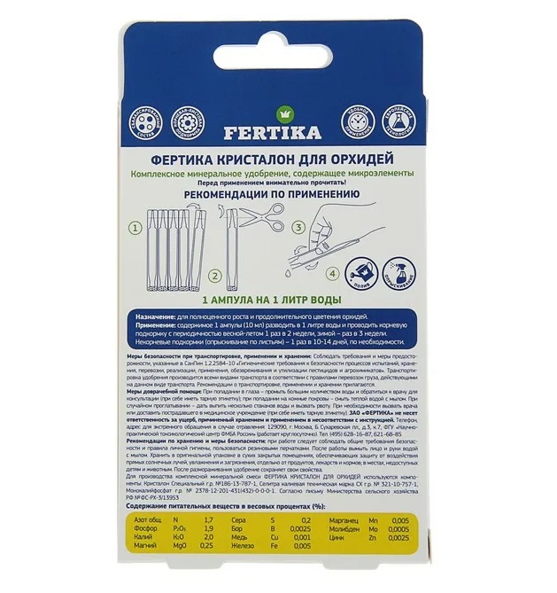 Минеральный комплекс представляет собой концентрированный жидкий раствор, выпускаемый в ампулах. Предназначен для питания, здорового роста и развития гортензий, азалий, рододендронов и вересковых культур. Нормы и способы внесения Корневые подкормки (полив): Содержимое 1 ампулы (10 мл) развести в 1 литре воды и поливать растения весной-летом 1 раз в 10-14 дней, зимой - раз в 3 недели, в открытом грунте - в течение сезона вегетации раз в 2 недели. Не корневые подкормки (опрыскивание по листьям): 1 раз в 10-14 дней, по необходимости. NPK: N (Азот) -1,1; P (Фосфор) -0,9; K (Калий) -2,2. Похожие товары
